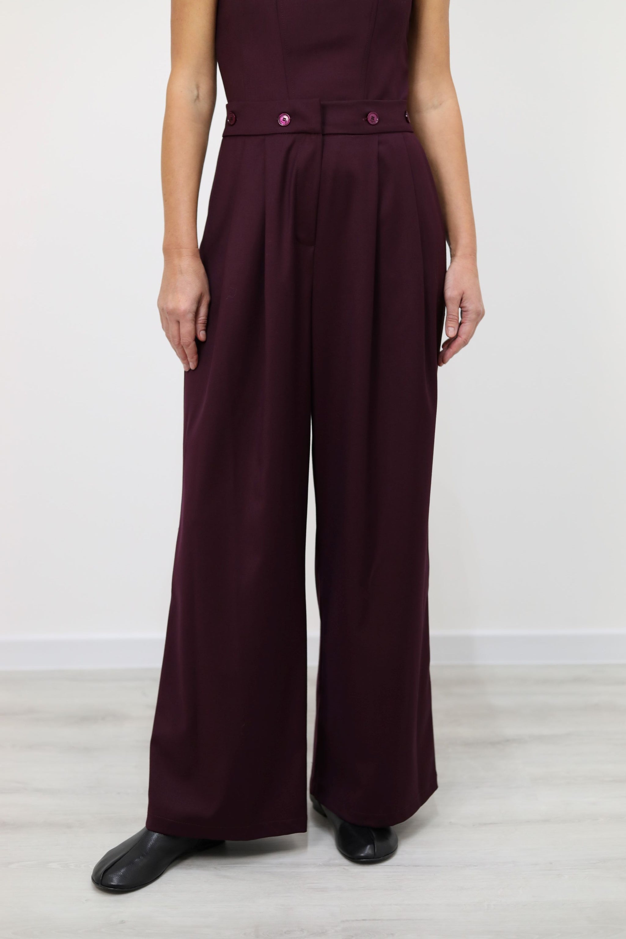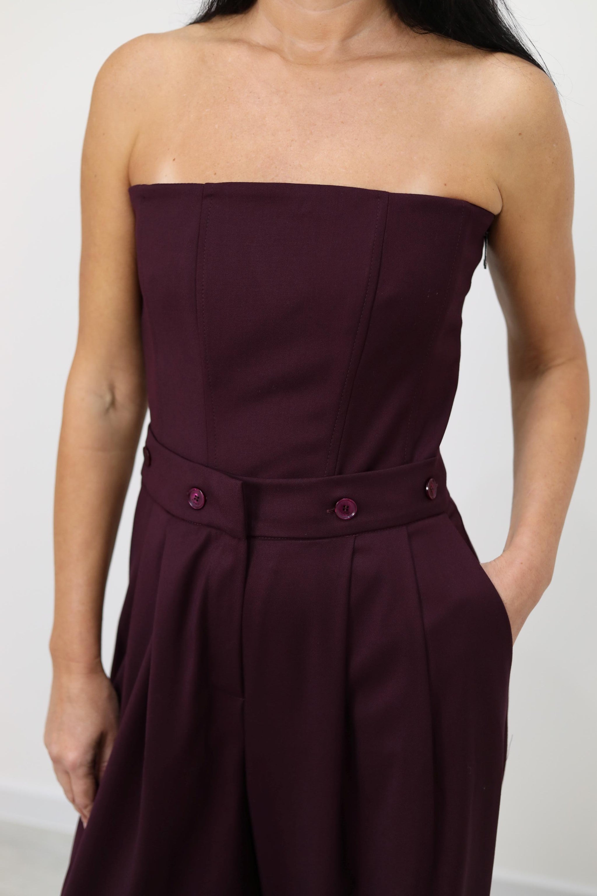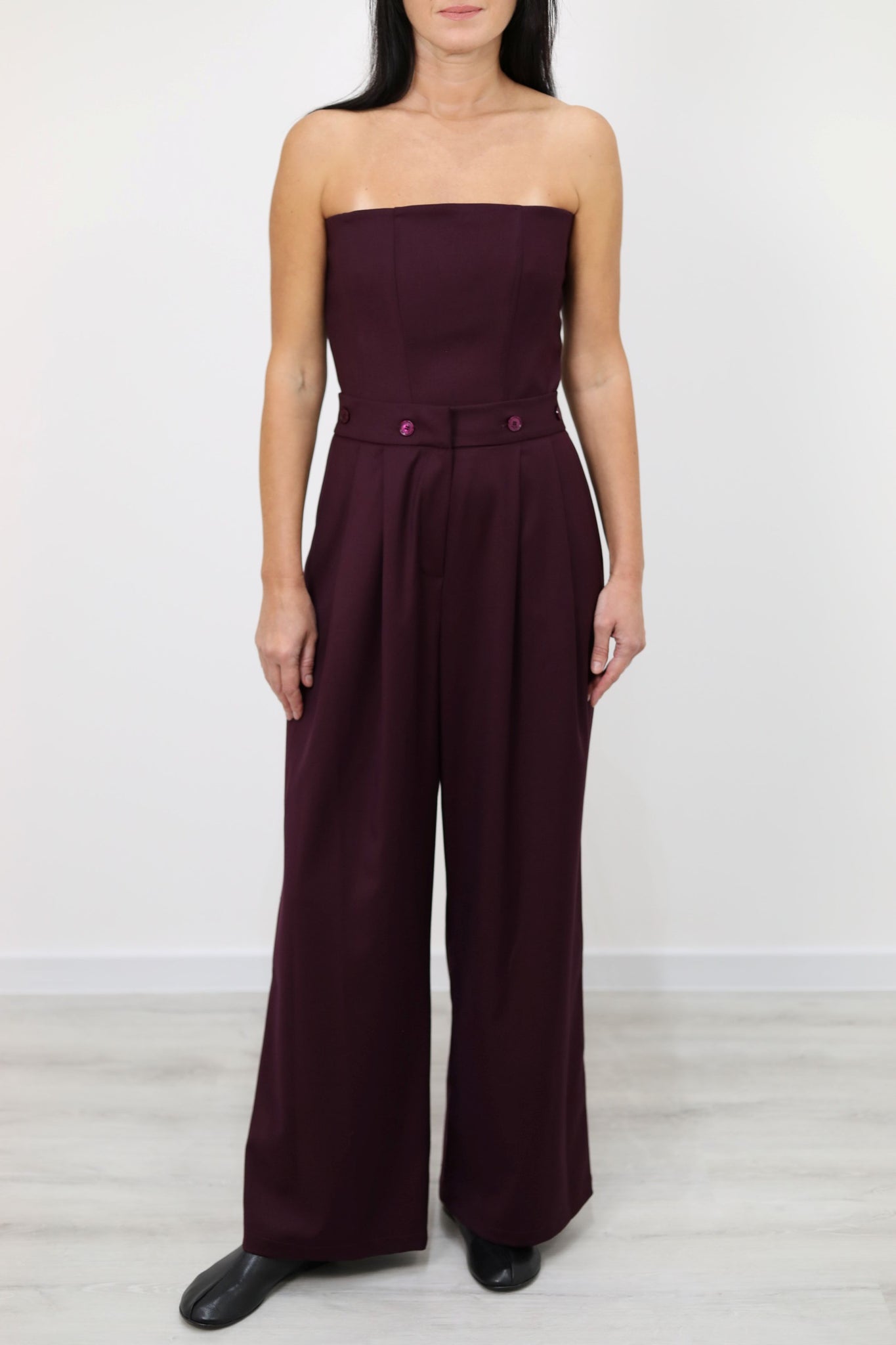 Tuta elegante composta da corpetto strutturato con zip laterale e pantalone a gamba dritta con pinces frontali. Il corpetto è staccabile, permettendo di indossare i capi anche separatamente per creare look diversi.