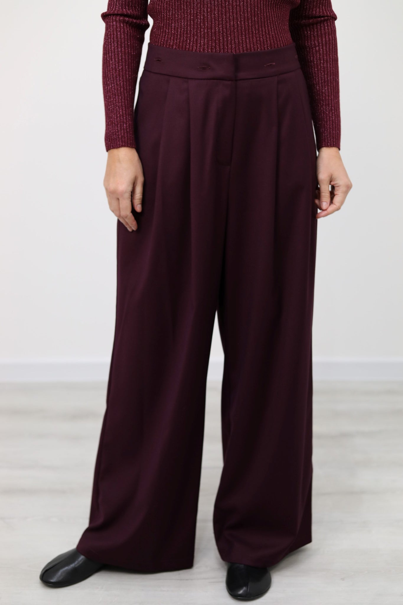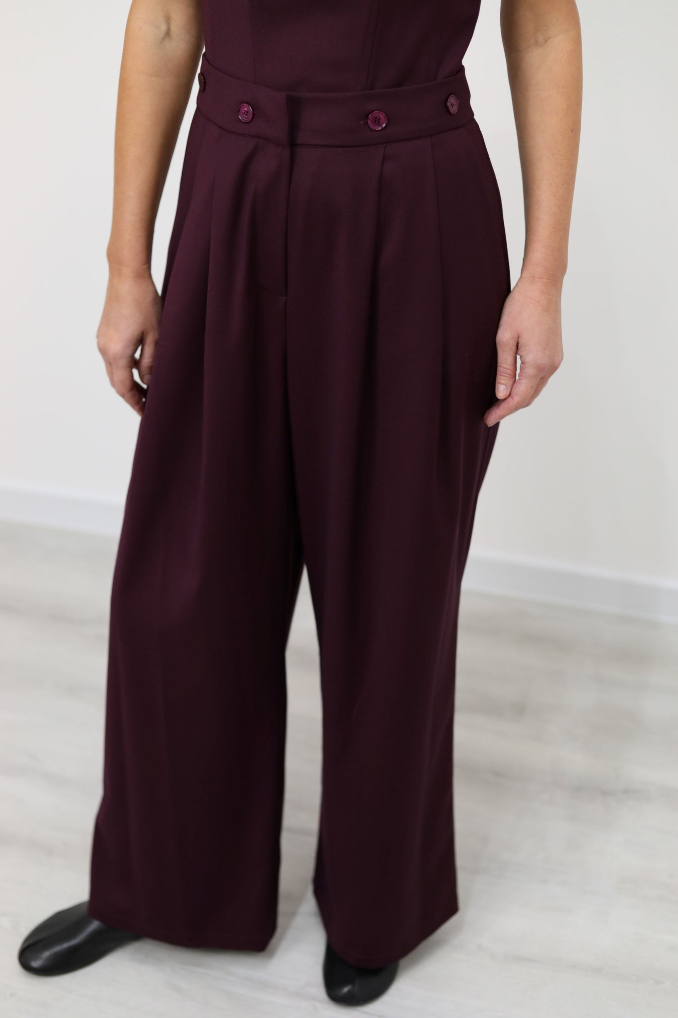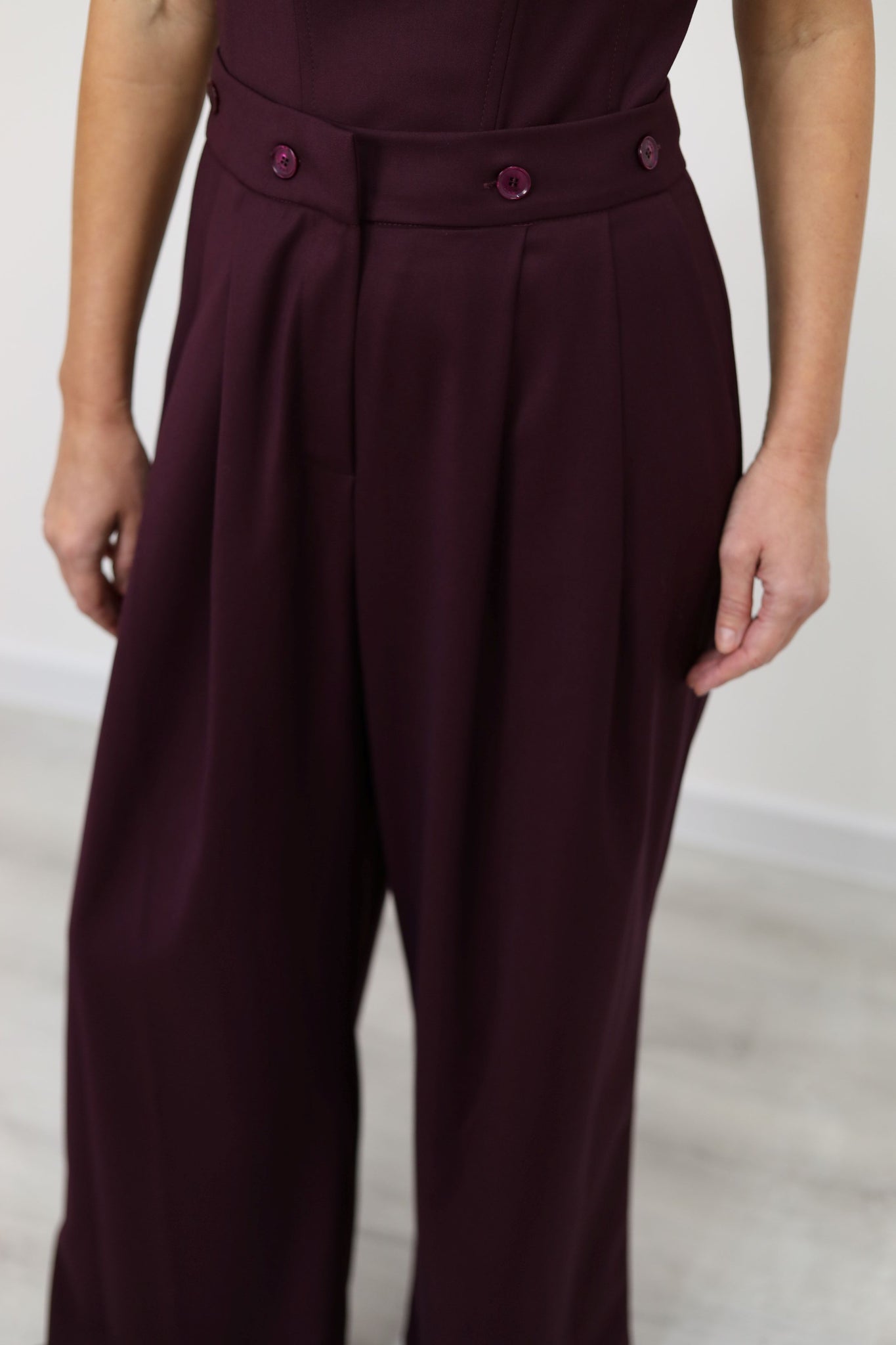 Tuta elegante composta da corpetto strutturato con zip laterale e pantalone a gamba dritta con pinces frontali. Il corpetto è staccabile, permettendo di indossare i capi anche separatamente per creare look diversi.