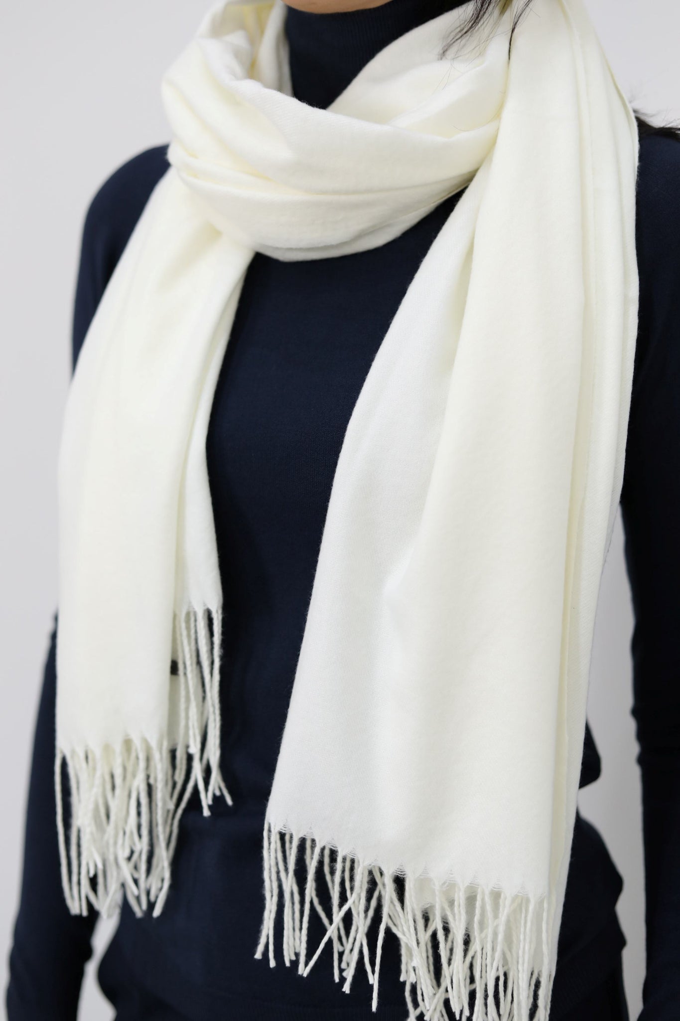 Sciarpa in morbida viscosa tinta unita con frange sottili alle estremità.