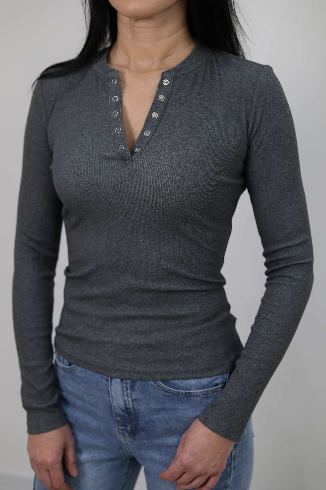 Maglia a costine con maniche lunghe e bottoni a pressione sul petto. Vestibilità aderente.