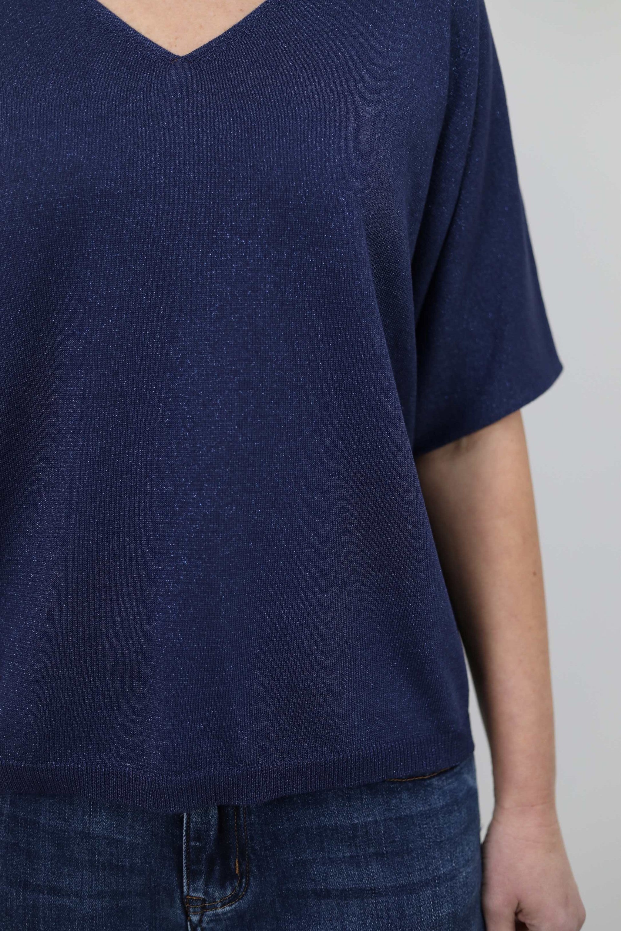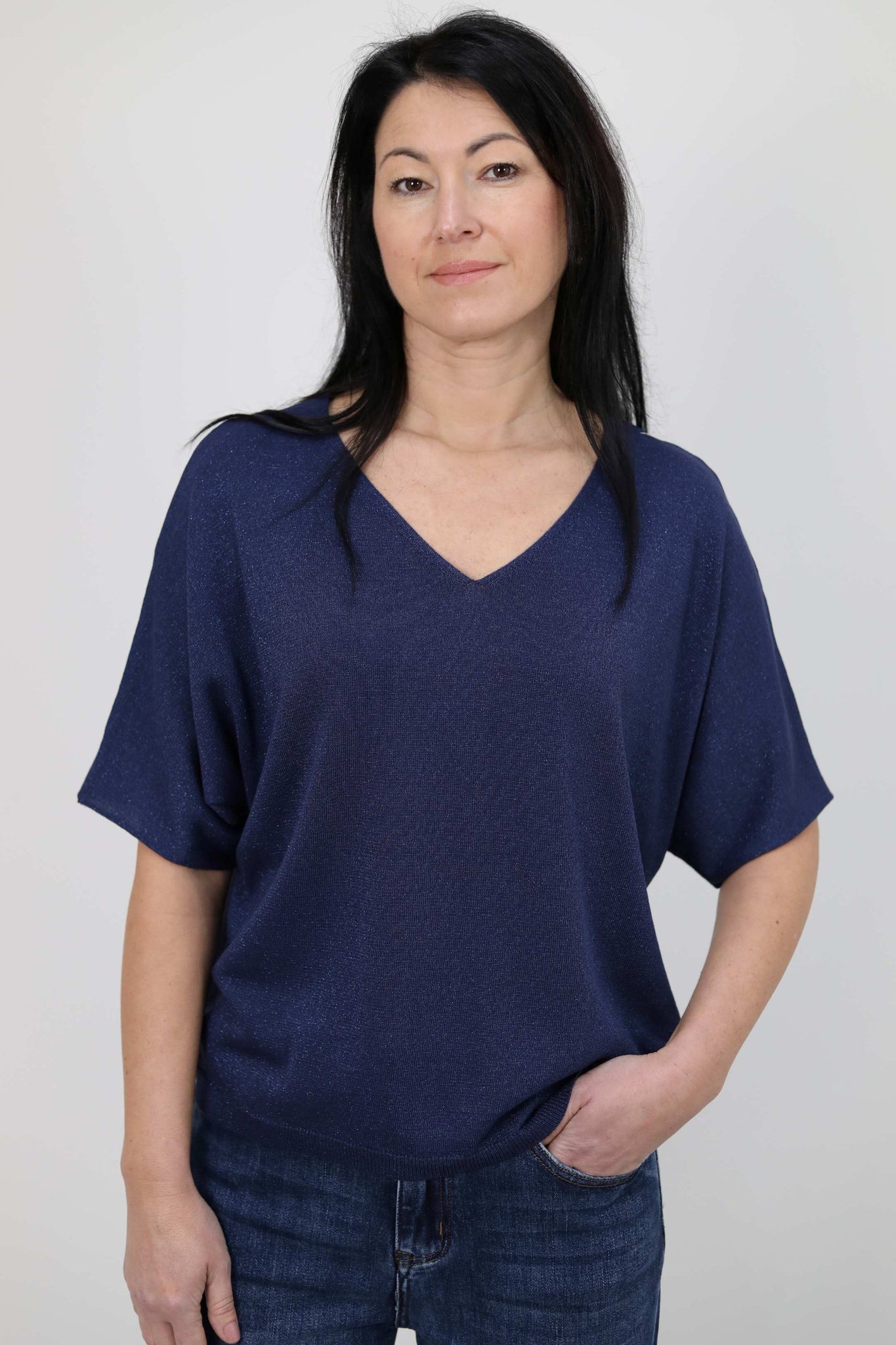 Maglia in filato leggero a base viscosa, arricchita da lurex. Presenta scollo a V e maniche a pipistrello che donano una linea morbida e fluida al capo. Fondo e polsini rifiniti a costine. Vestibilità morbida.