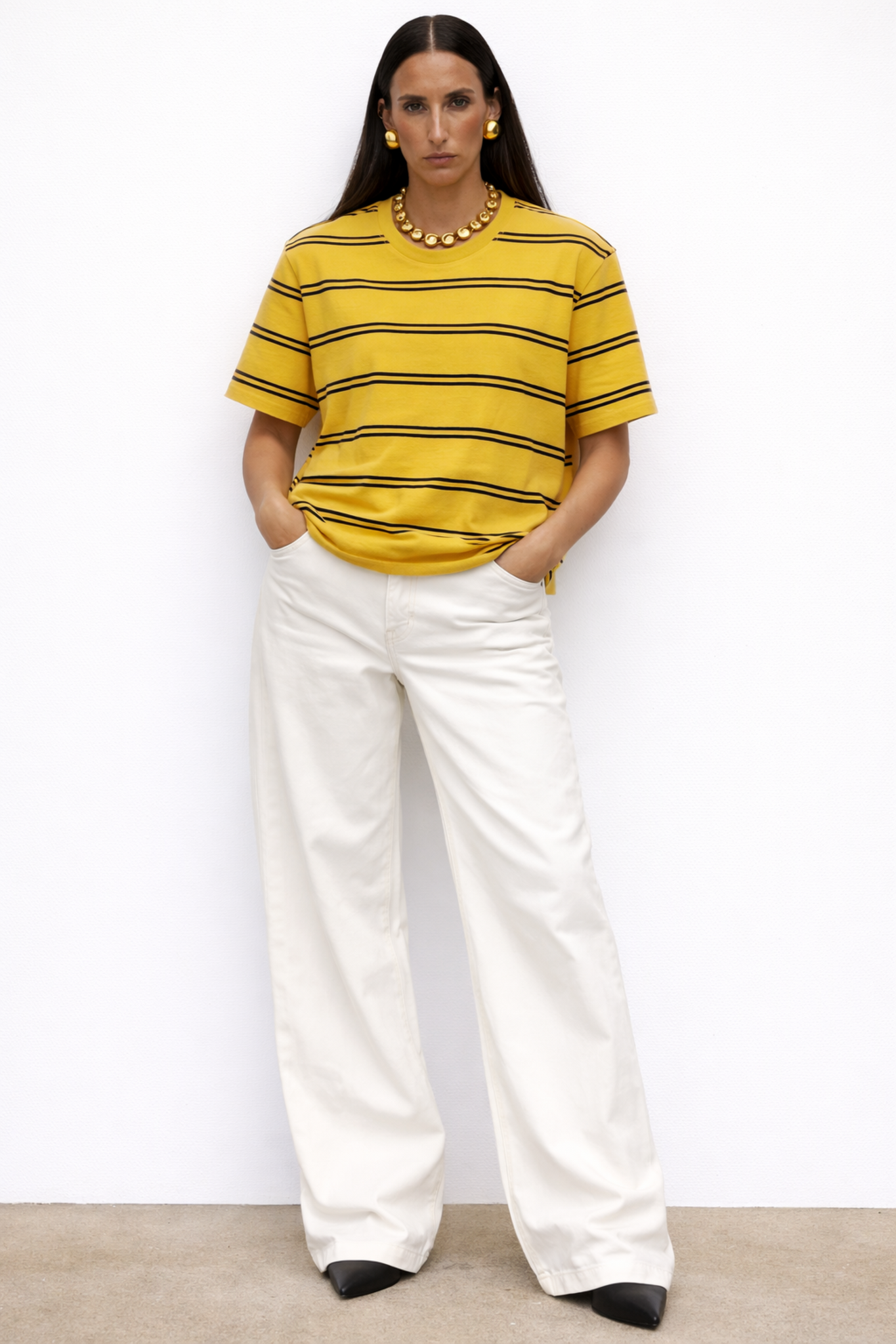 T-shirt in jersey di cotone. Modello oversize con girocollo. Manica corta ampia. Spalline imbottite interne. Fantasia a righe orizzontali.