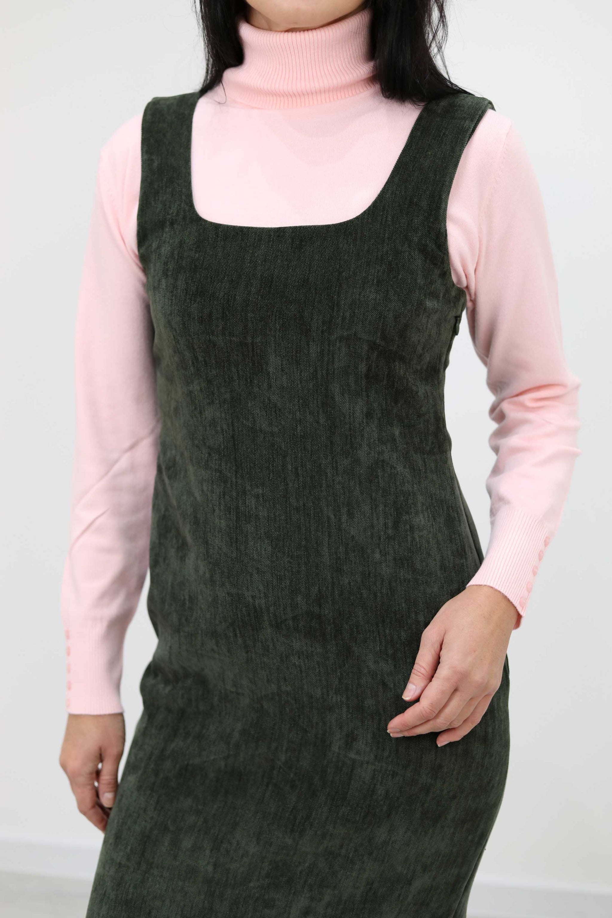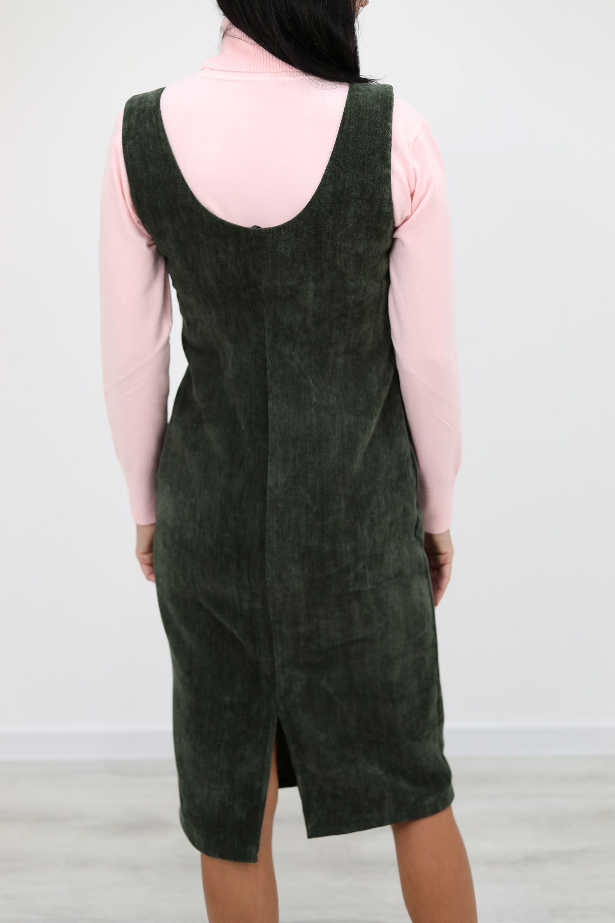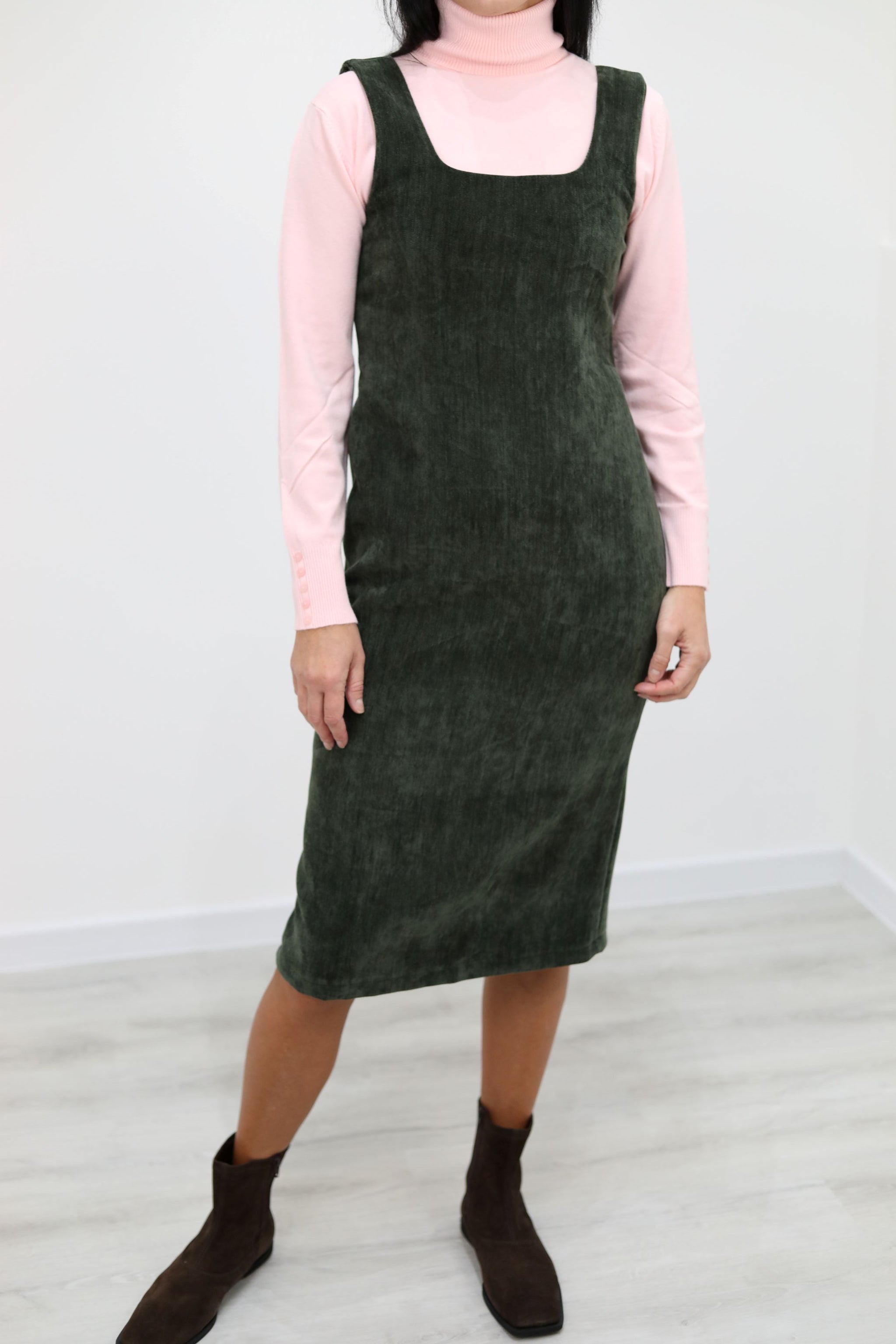 Abito midi smanicato in velluto a coste. Effetto avvitato, chiusura laterale con zip.