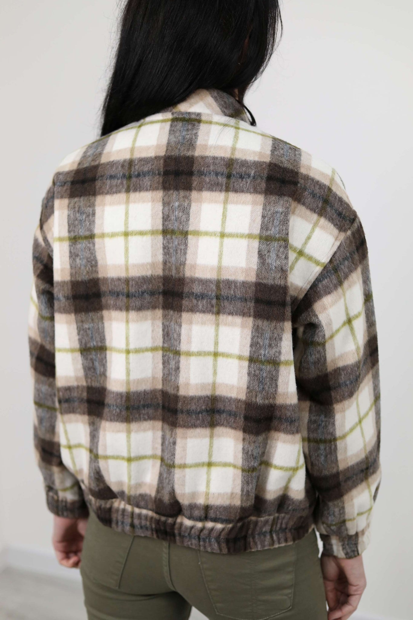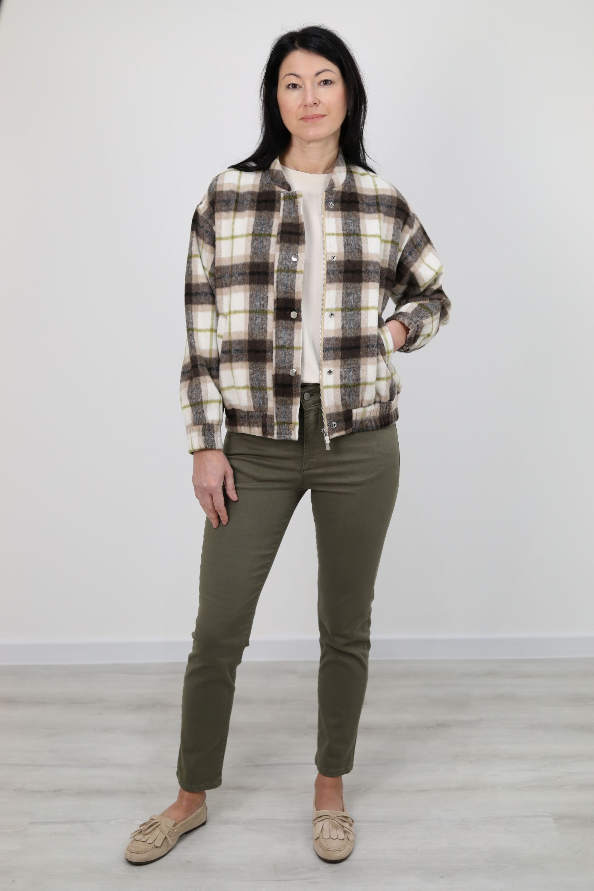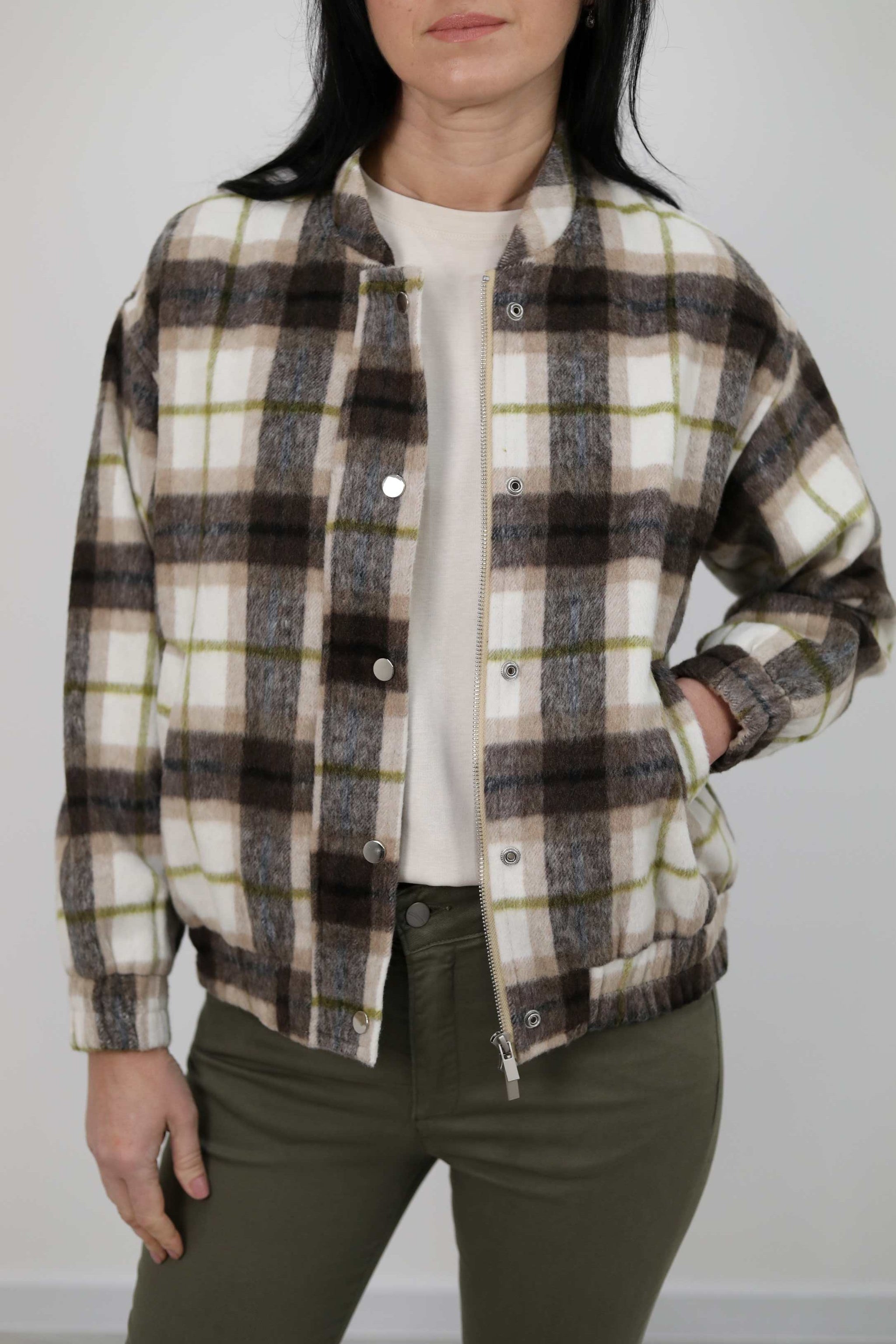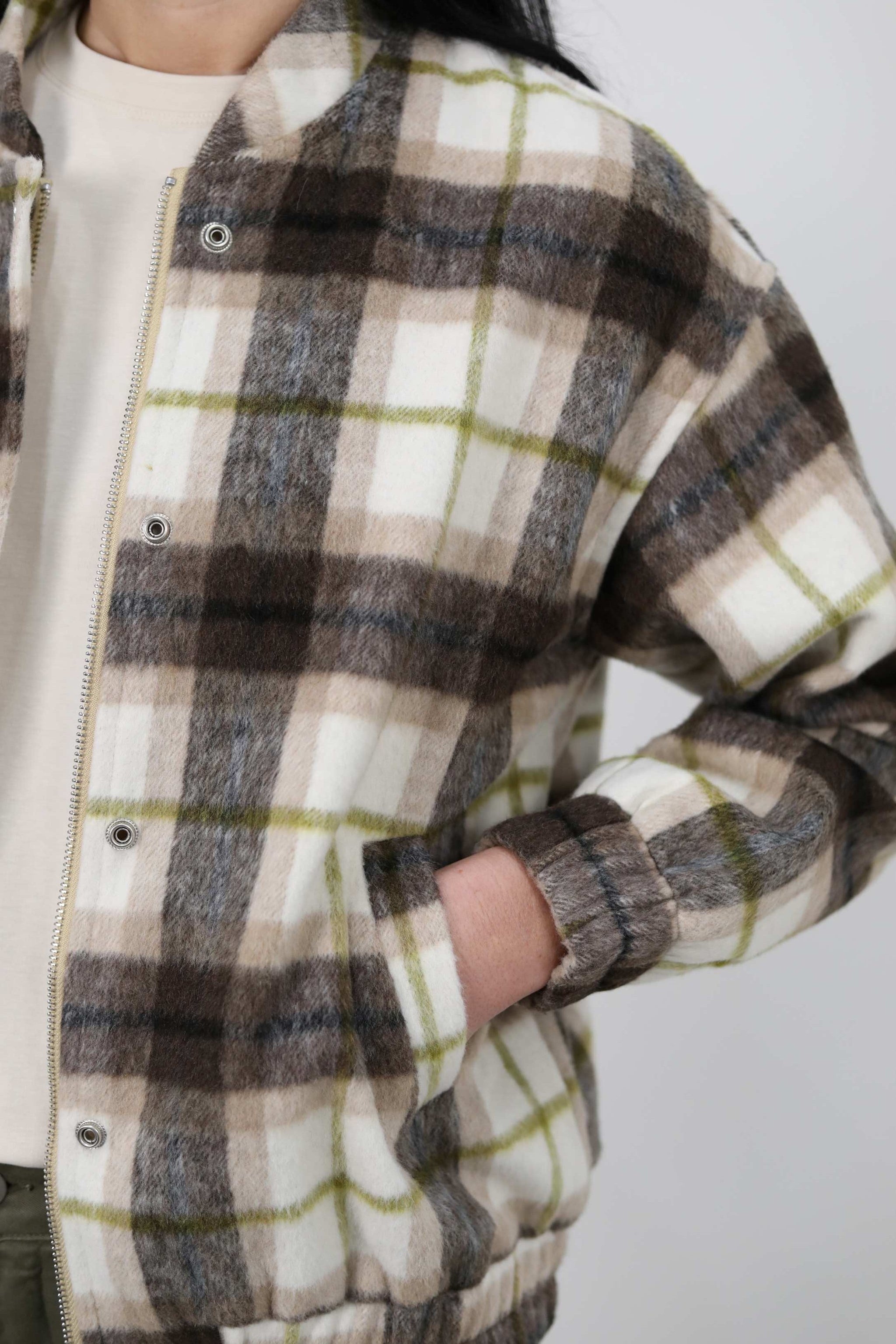Bomber misto lana effetto check con collo rotondo, polsini elasticizzati e tasche laterali. Chiusura frontale con bottoni e zip.