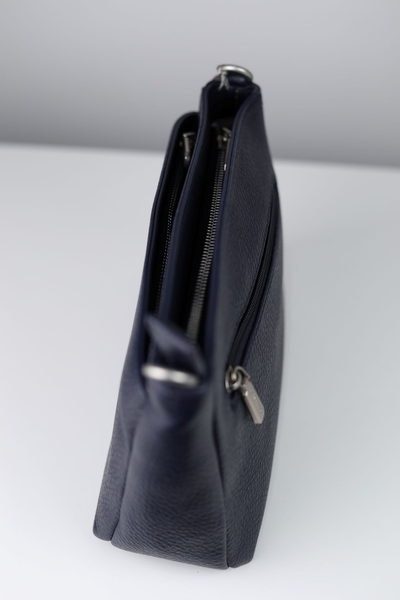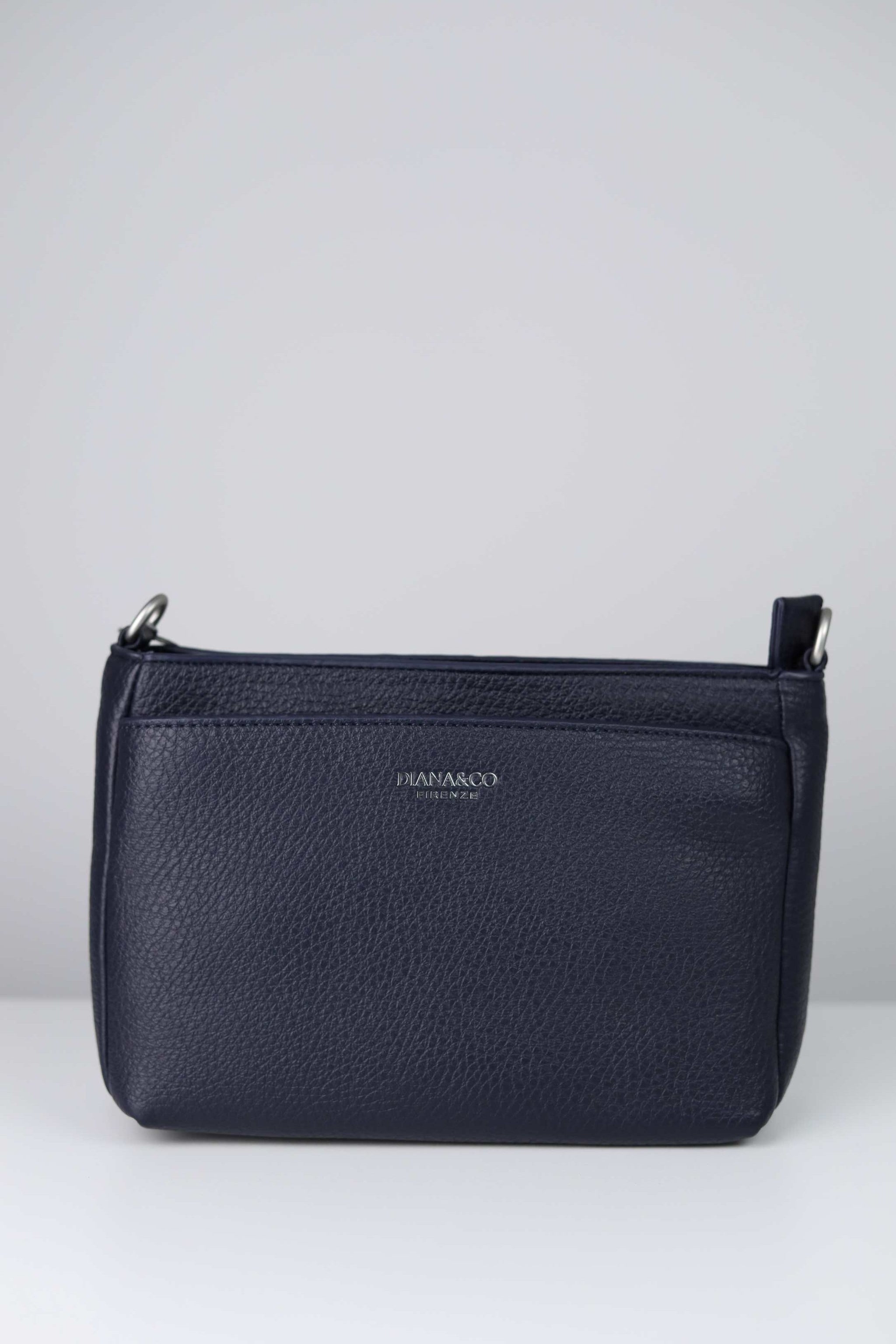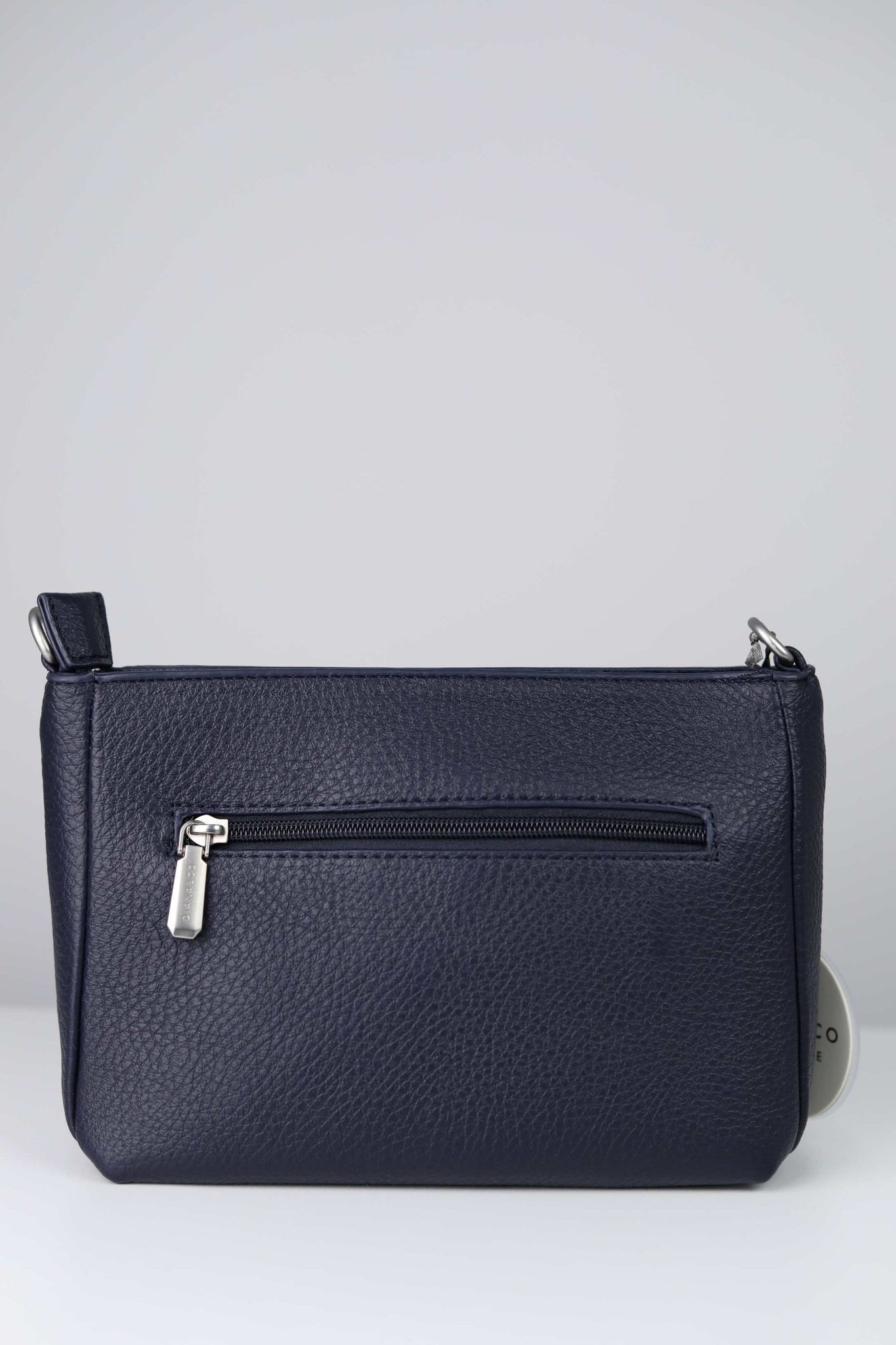 Borsa a spalla realizzata in pelle sintetica martellata, dotata di tre scomparti interni con chiusura superiore tramite zip. Modello con tasca esterna con zip sul retro e tracolla regolabile in tessuto. Interno foderato.