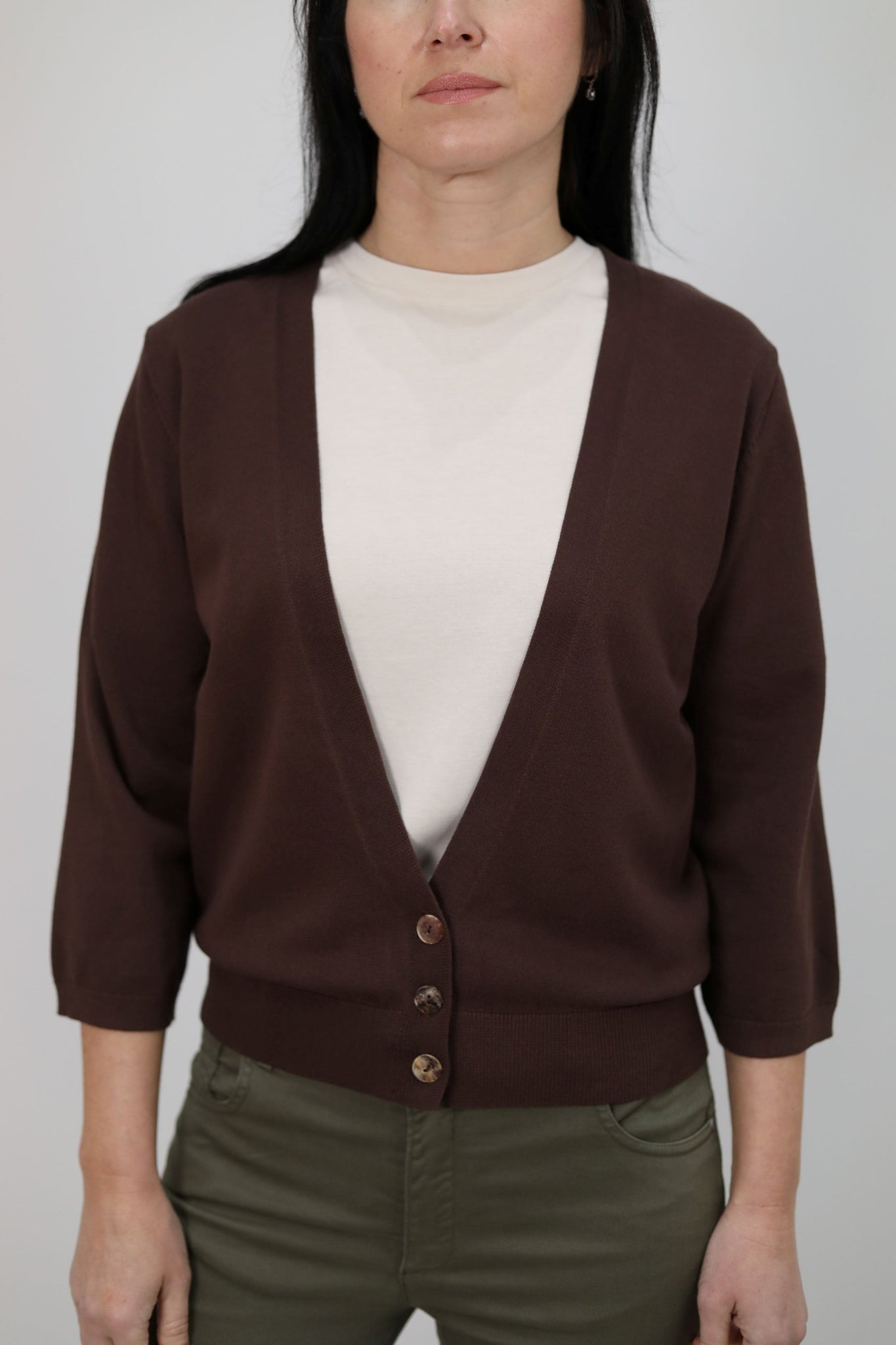 Cardigan in maglia leggera caratterizzato da scollo a V profondo e chiusura frontale con bottoni. Modello cropped con linea morbida, fondo e polsini rifiniti a costine. Vestibilità regolare