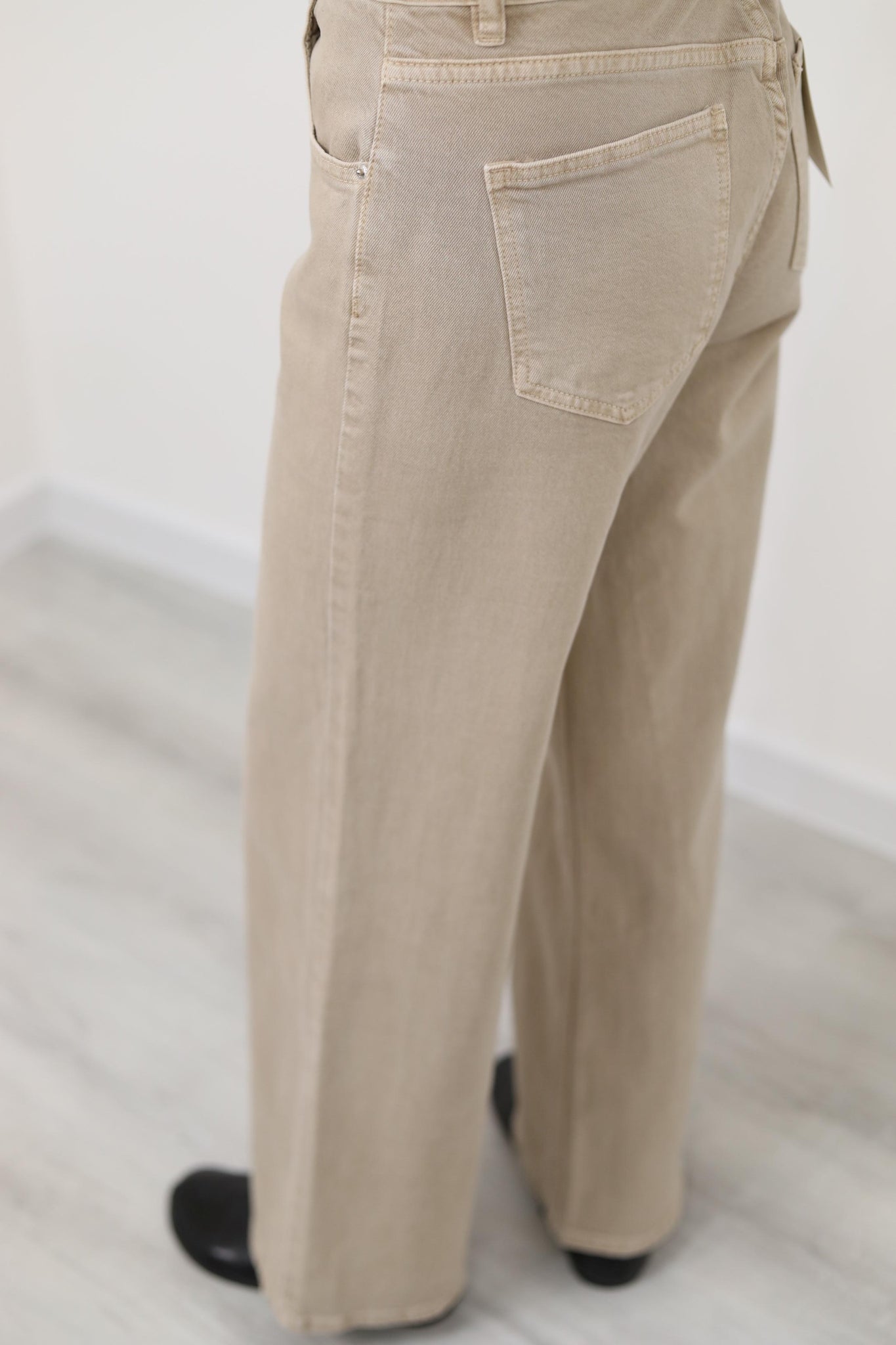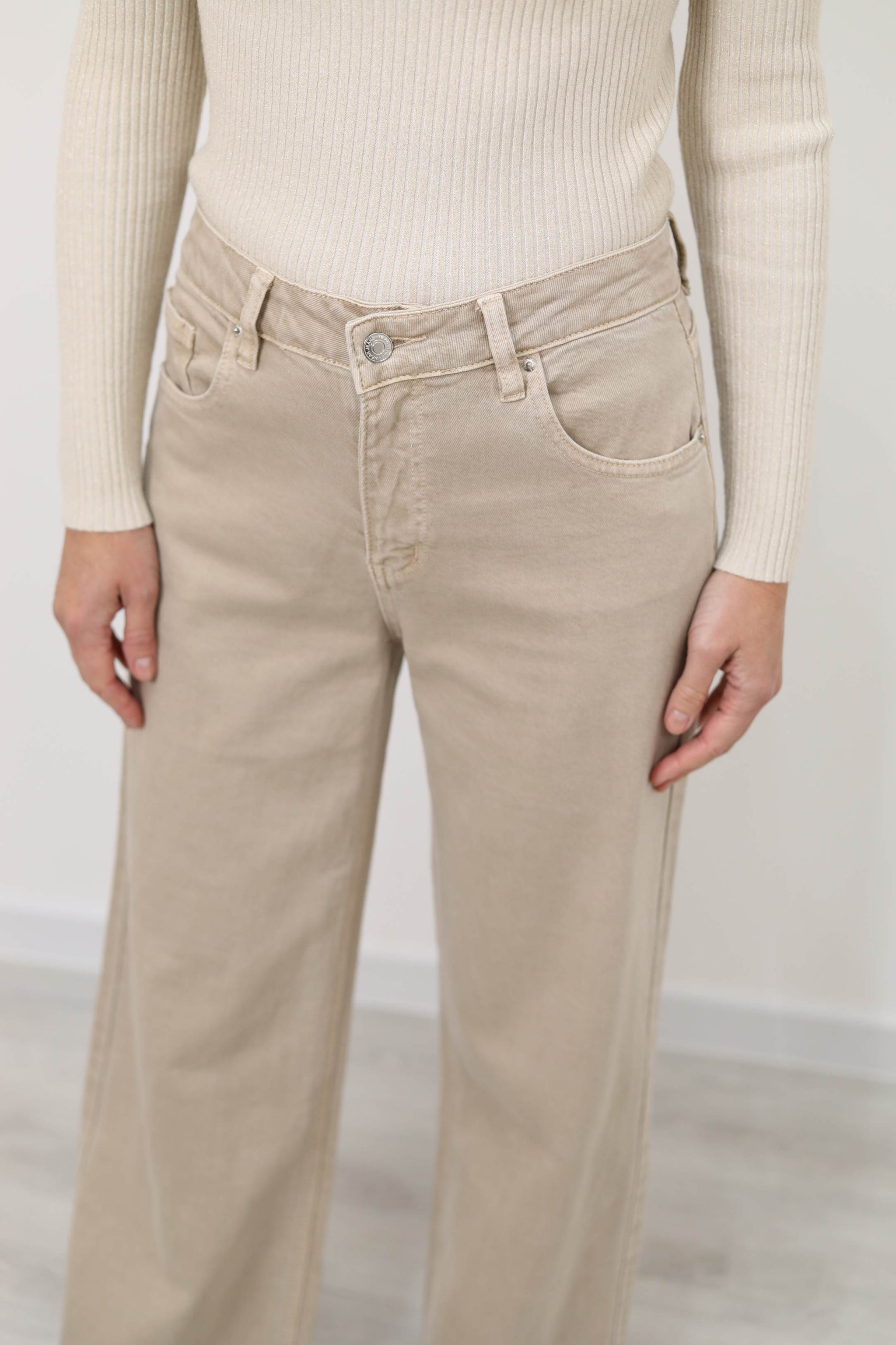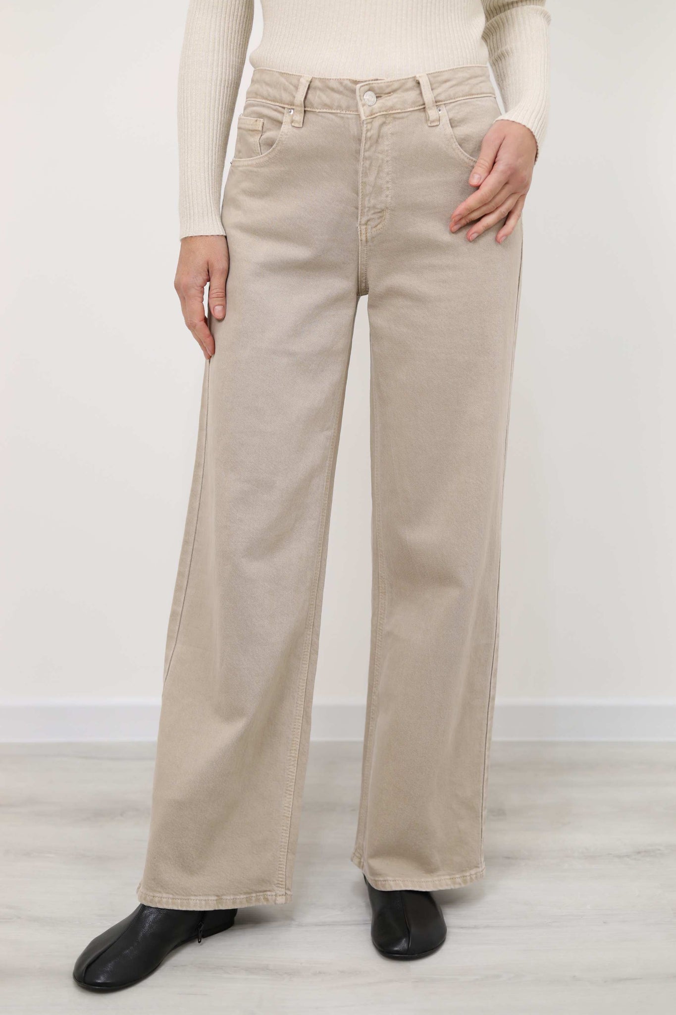 Denim in tessuto elasticizzato con gamba dritta e vita media. Modello cinque tasche, con passanti per cintura e chiusura frontale con bottone e zip.