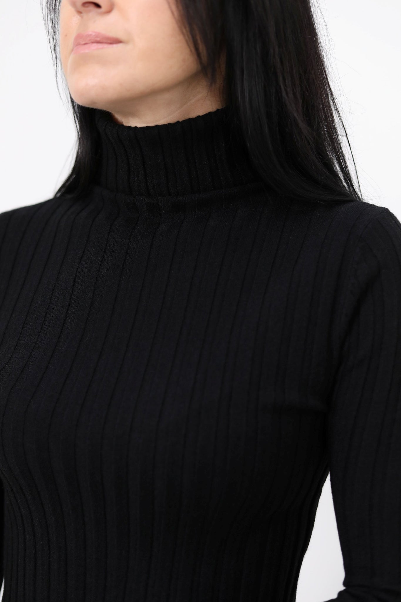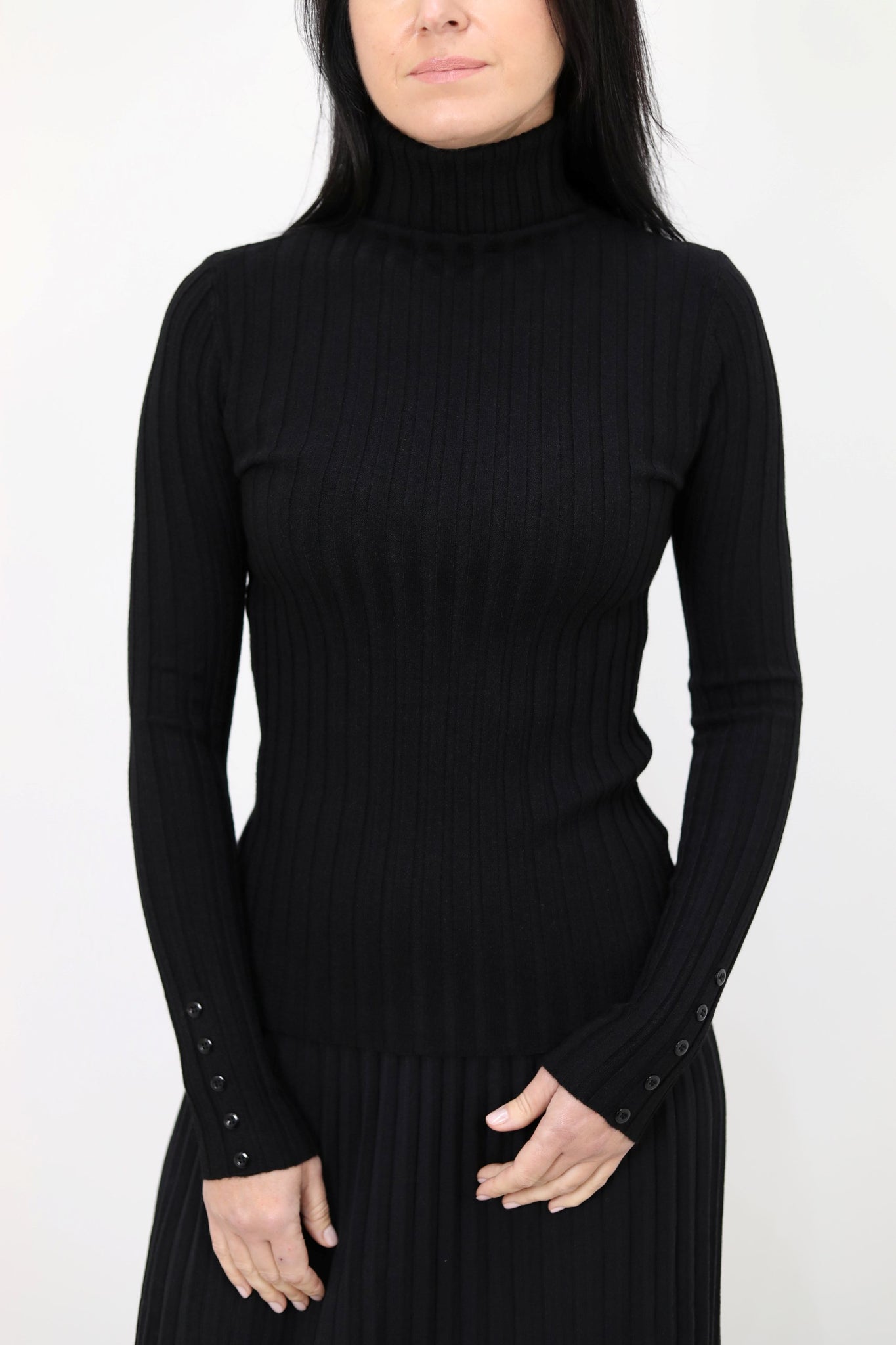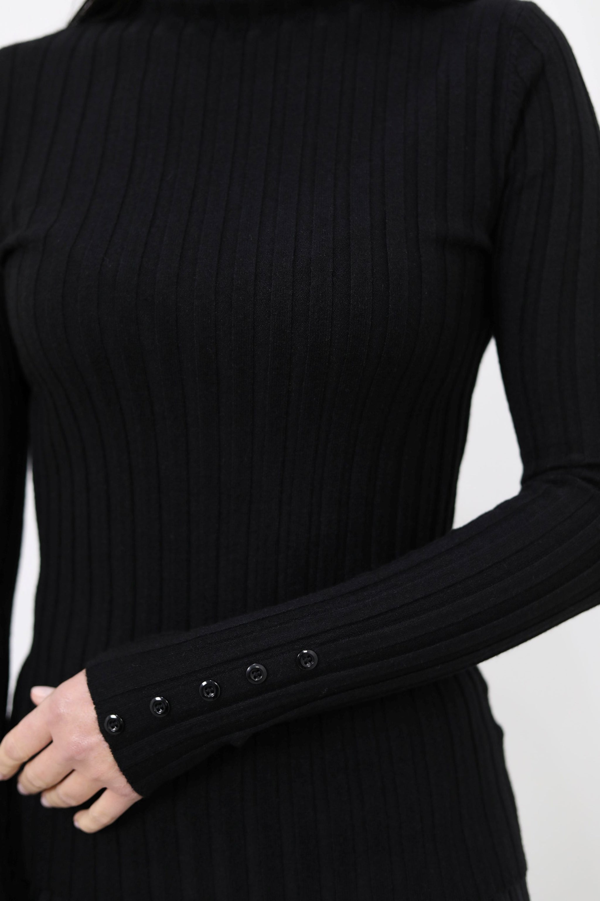 Dolcevita a costine in filato morbido e confortevole. Vestibilità slim e dettaglio di bottoni al fondo manica.