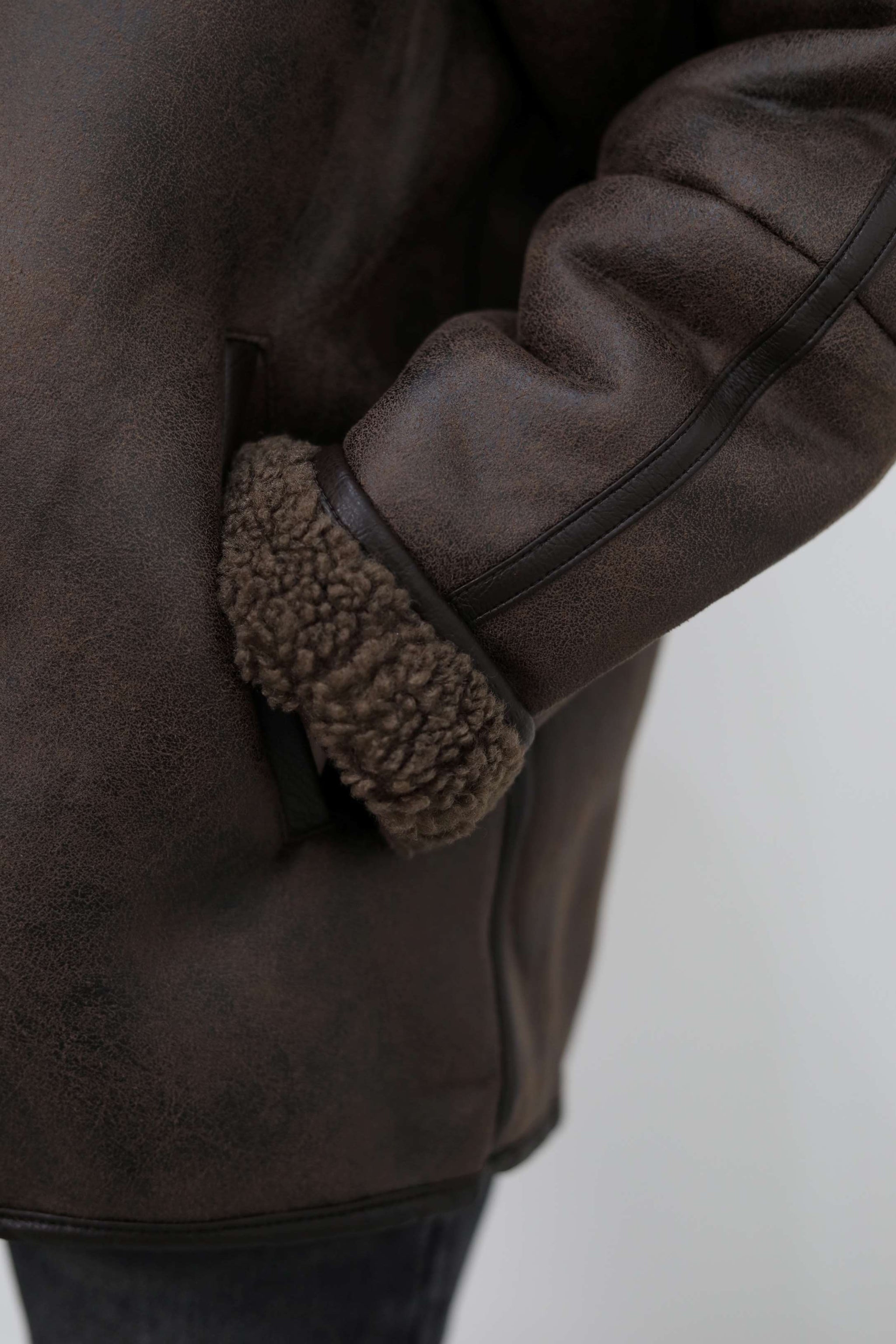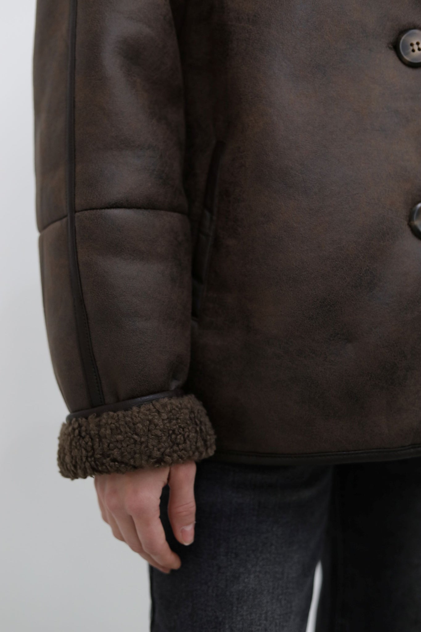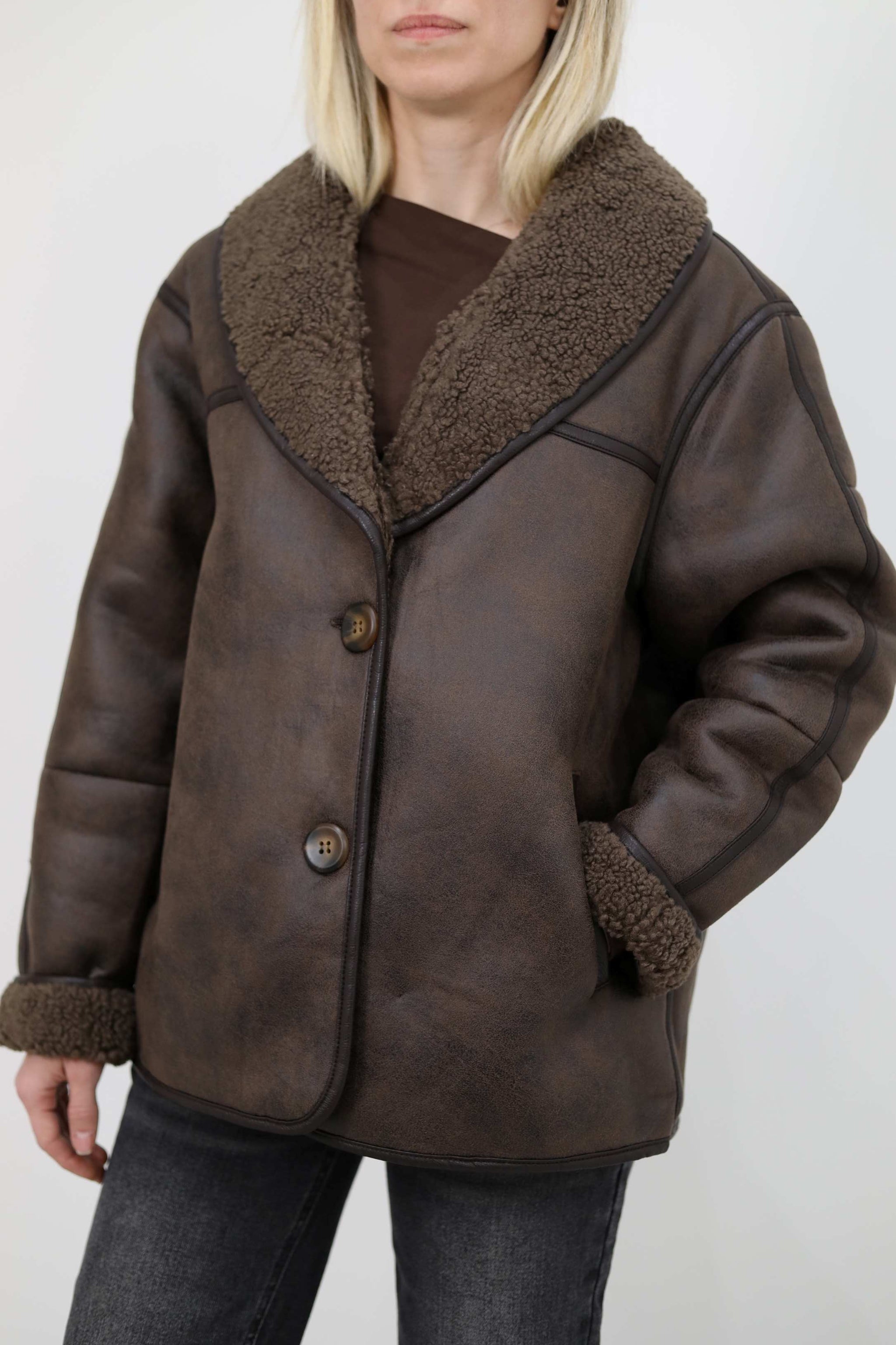 Eco-montone con interno teddy effetto shearling, maxi revers e chiusura con bottoni frontali. Vestibilità leggermente oversize, tasche laterali, dettagli a contrasto e finitura soft-touch.