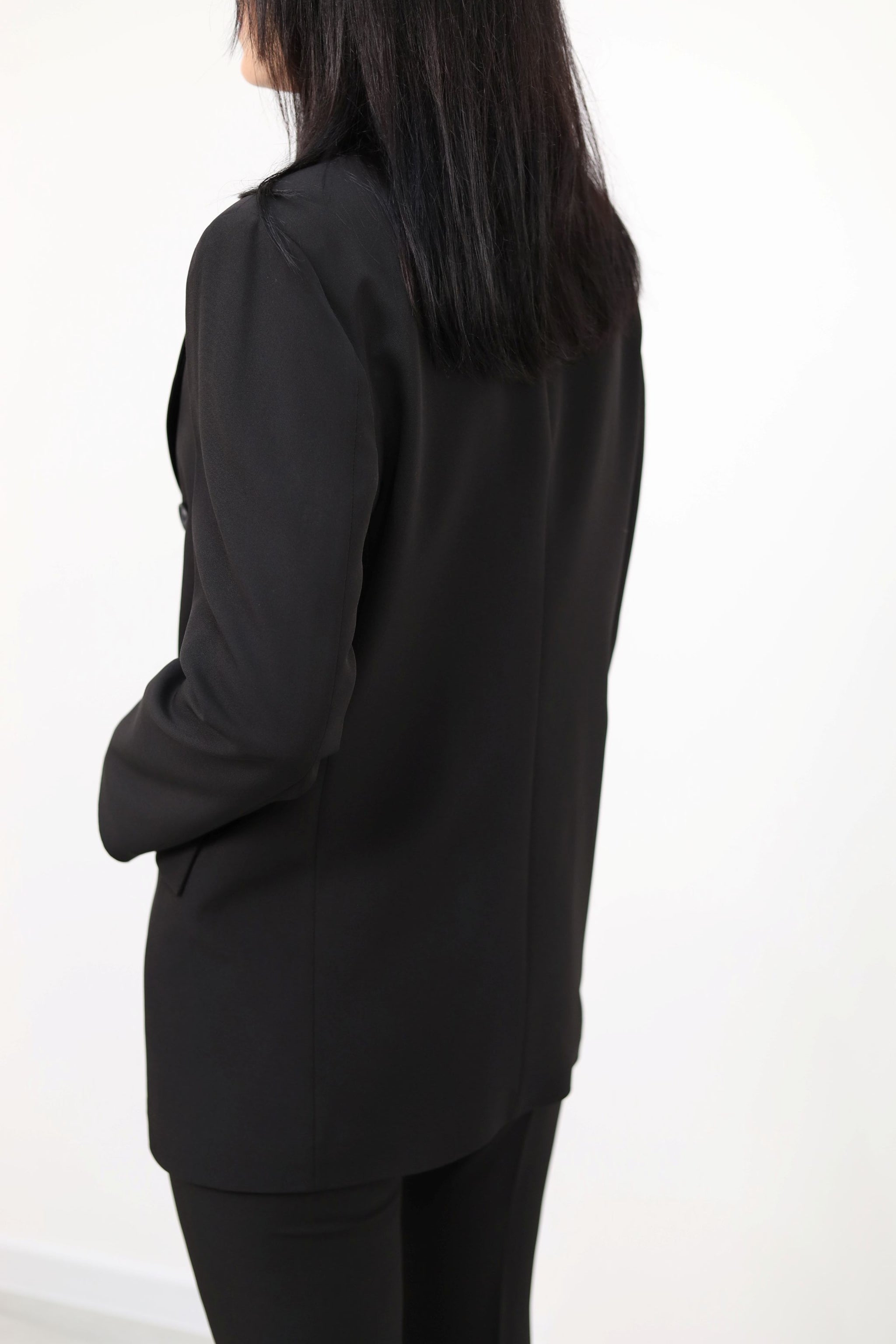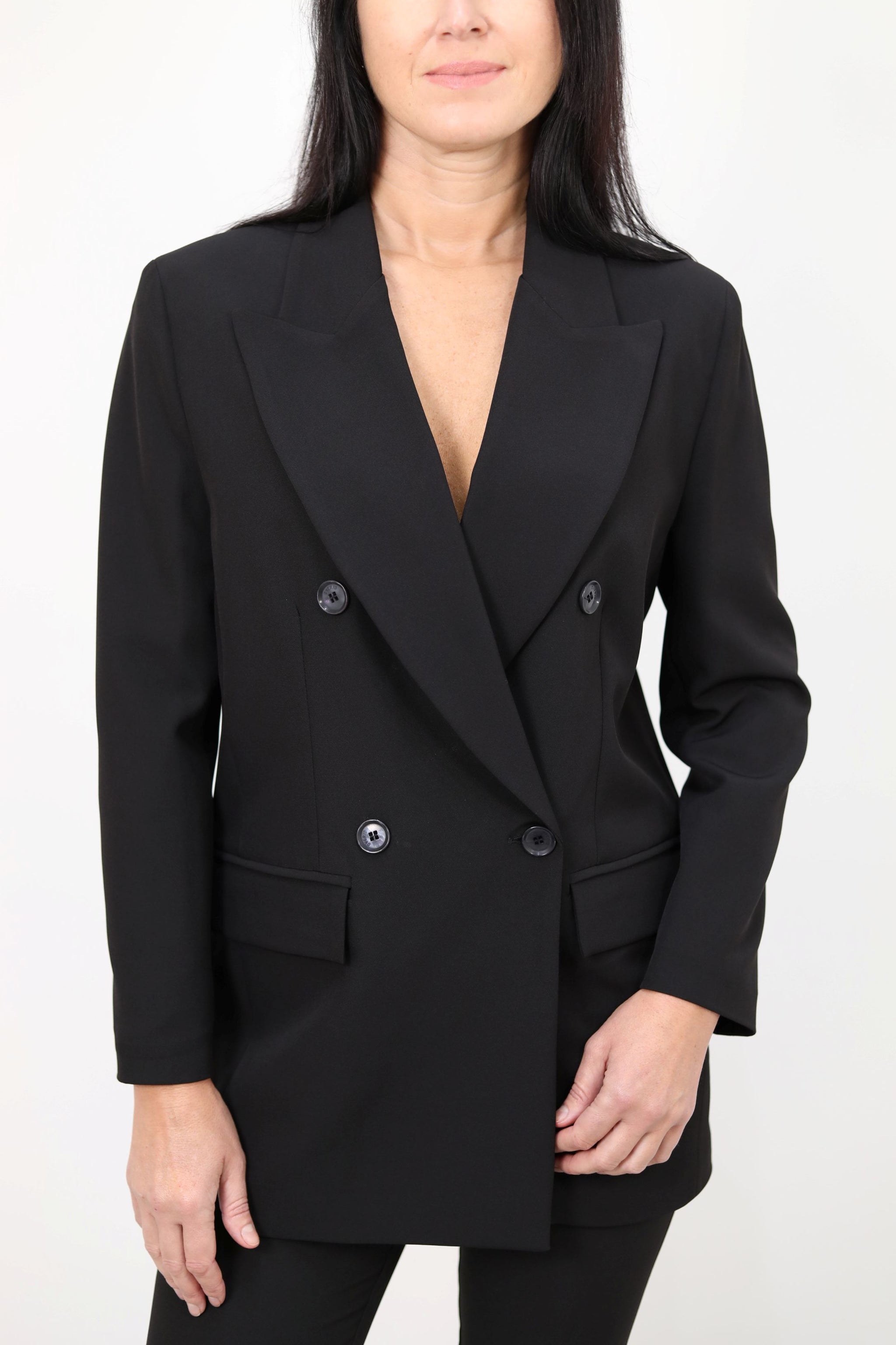 Giacca doppiopetto taglio sartoriale. Presenta rever a lancia pronunciati, chiusura frontale con doppio bottone, tasche con patta e spalle strutturate. Linea dritta, vestibilità regolare. Tessuto liscio, finitura opaca.