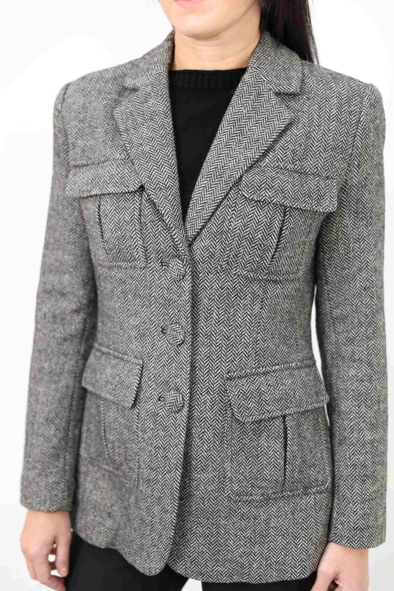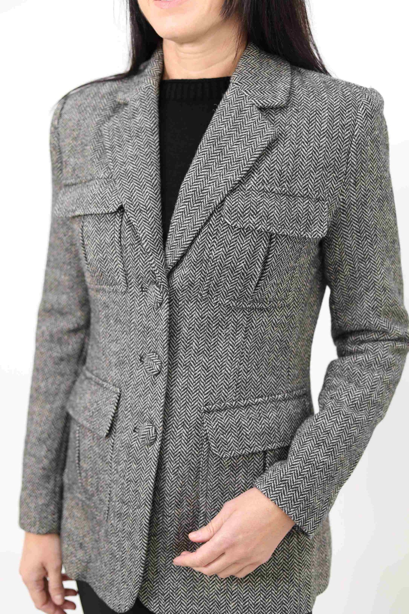 Giacca realizzata in tessuto tweed con motivo spigato. Presenta revers a lancia e una struttura leggermente avvitata. Dotata di quattro tasche applicate con patta, due sul petto e due nella parte inferiore.