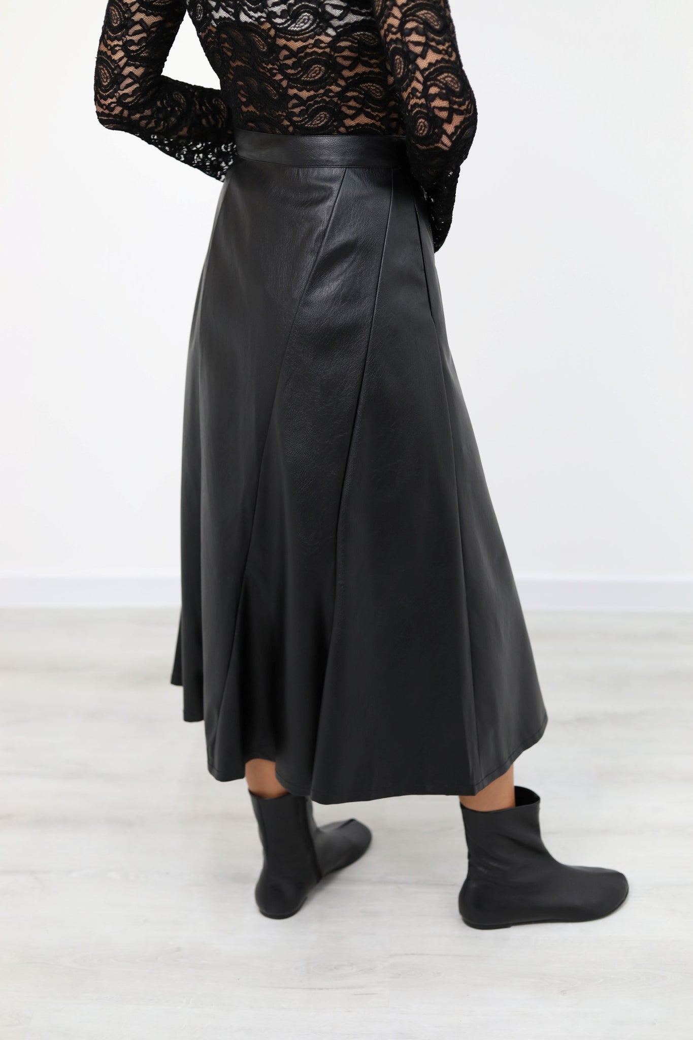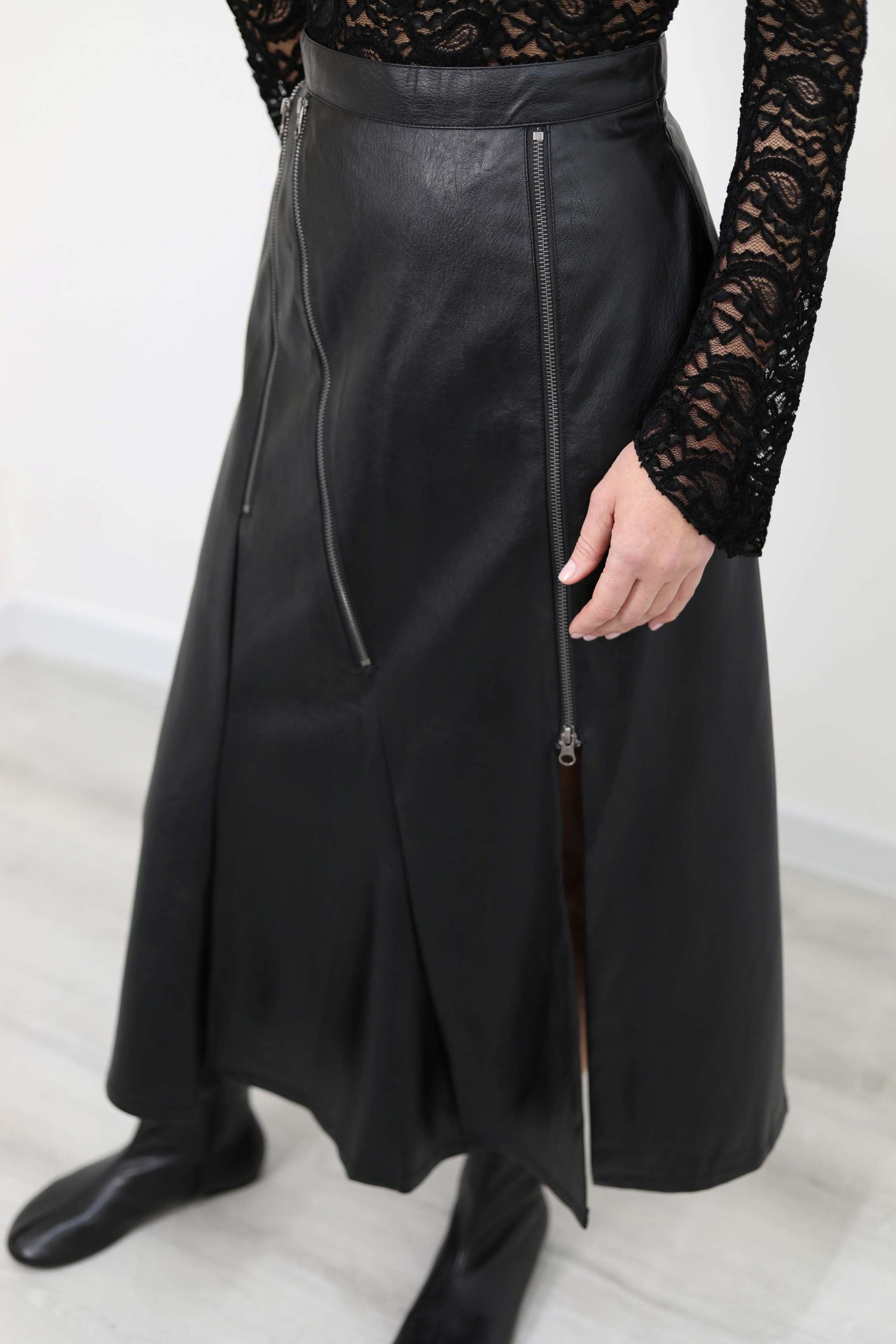 Gonna midi in eco-pelle, caratterizzata da doppie zip metalliche frontali e laterali che permettono di modulare l’apertura. Vita alta strutturata, linea svasata, tasche laterali e chiusura laterale con bottone e zip.