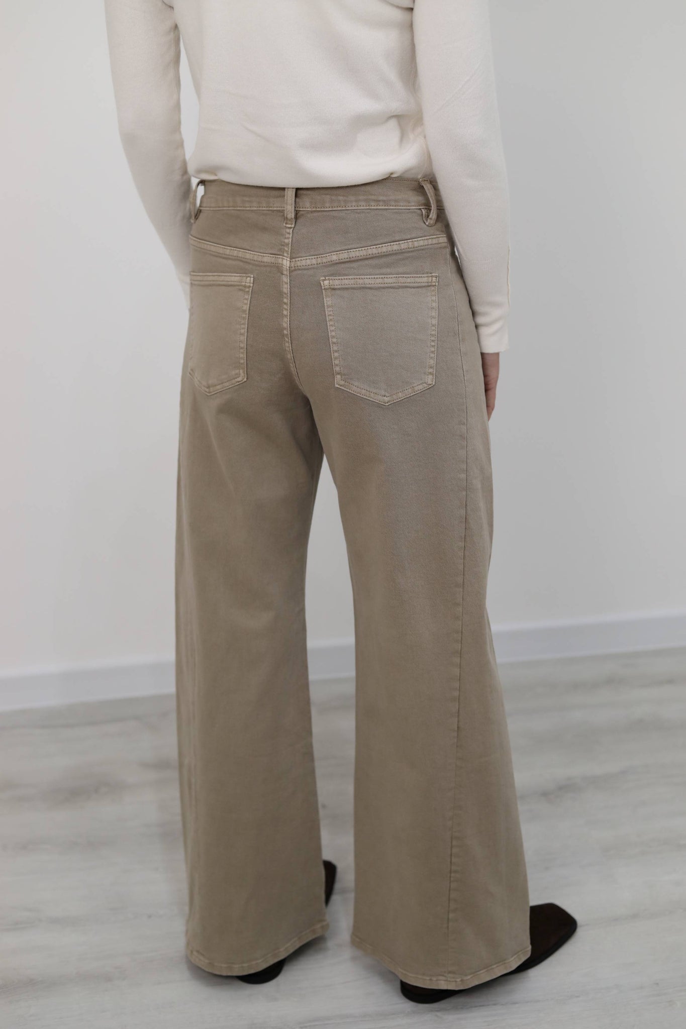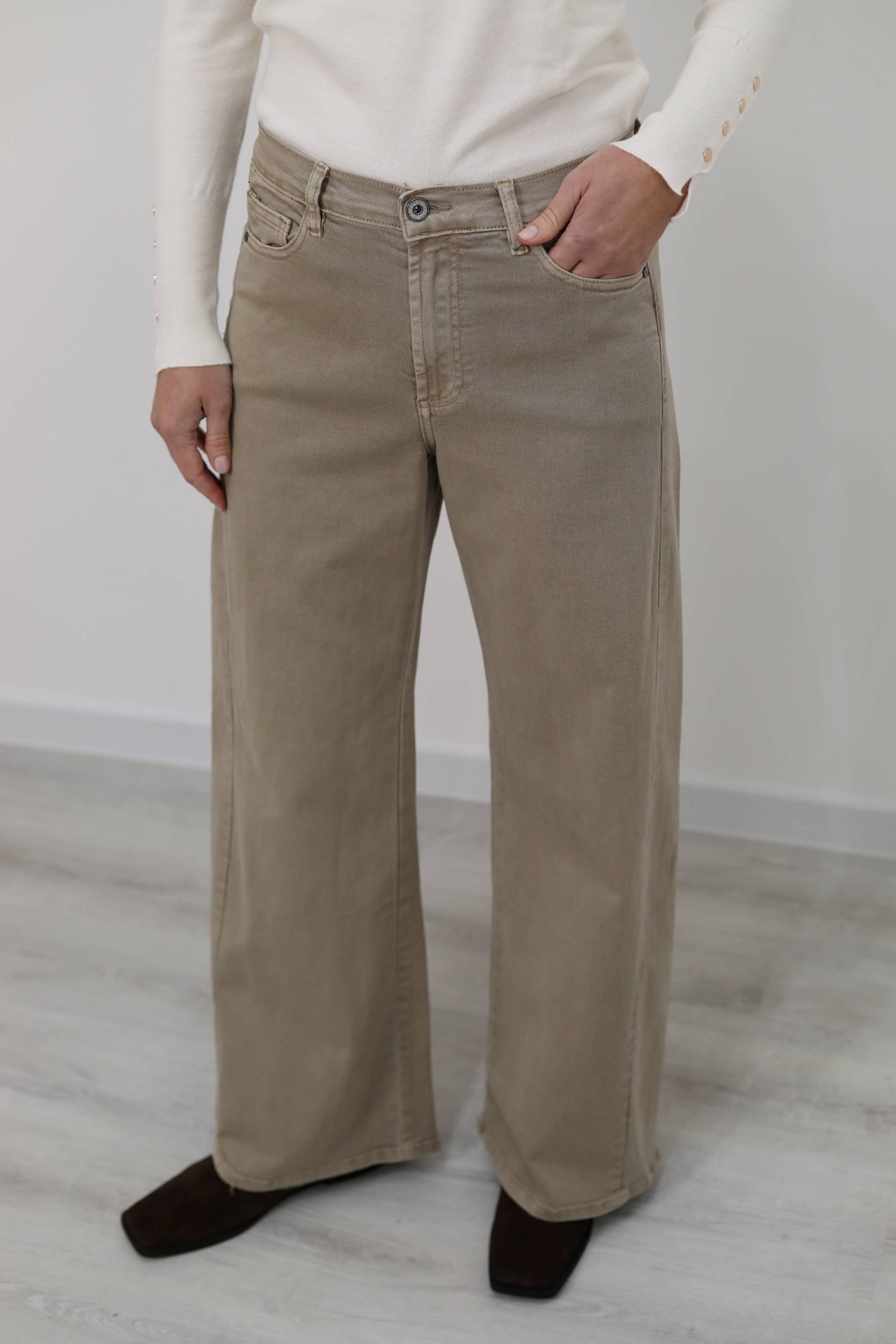 Modello wide leg a cinque tasche, con vita alta. Elasticizzato.