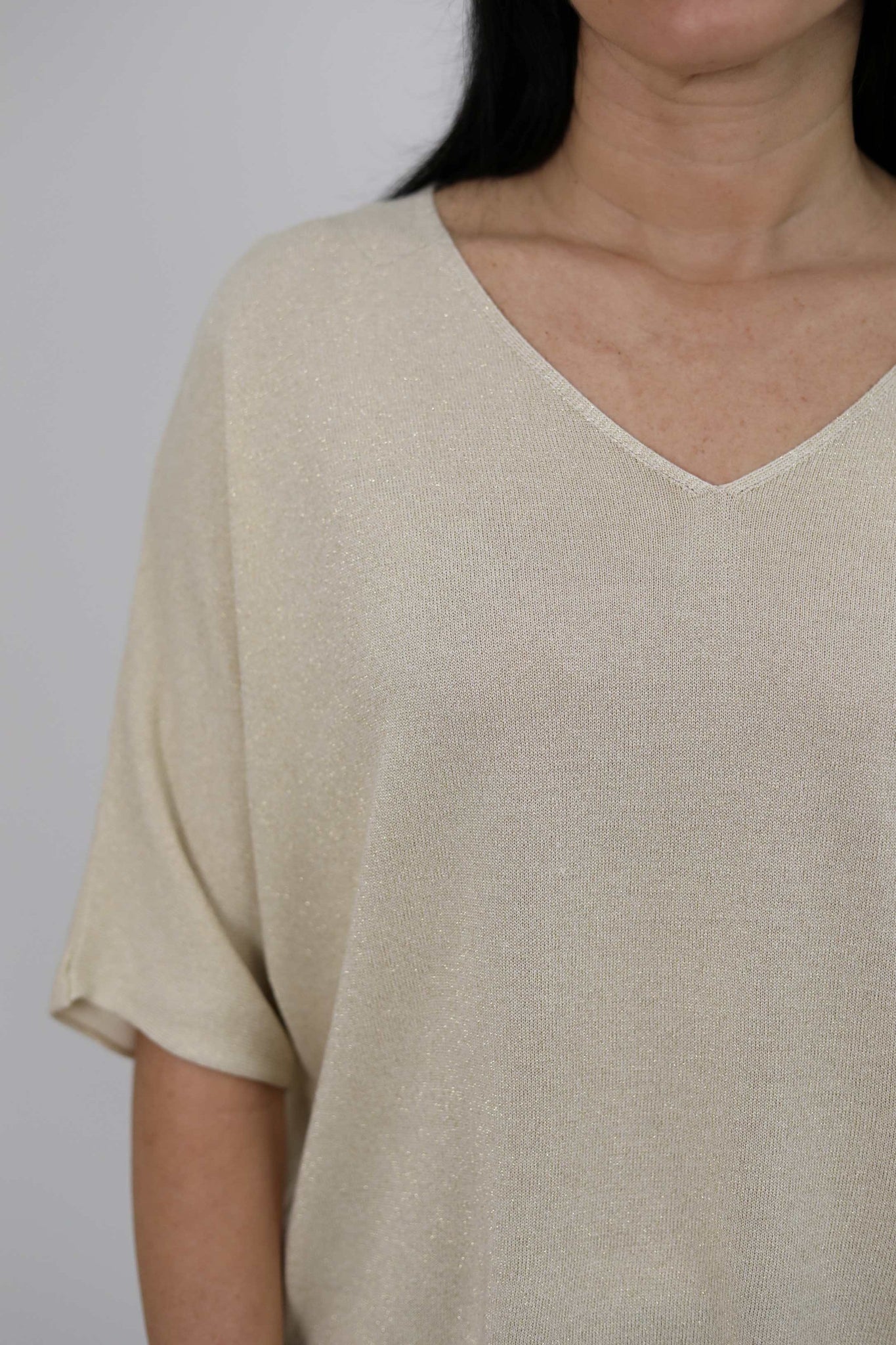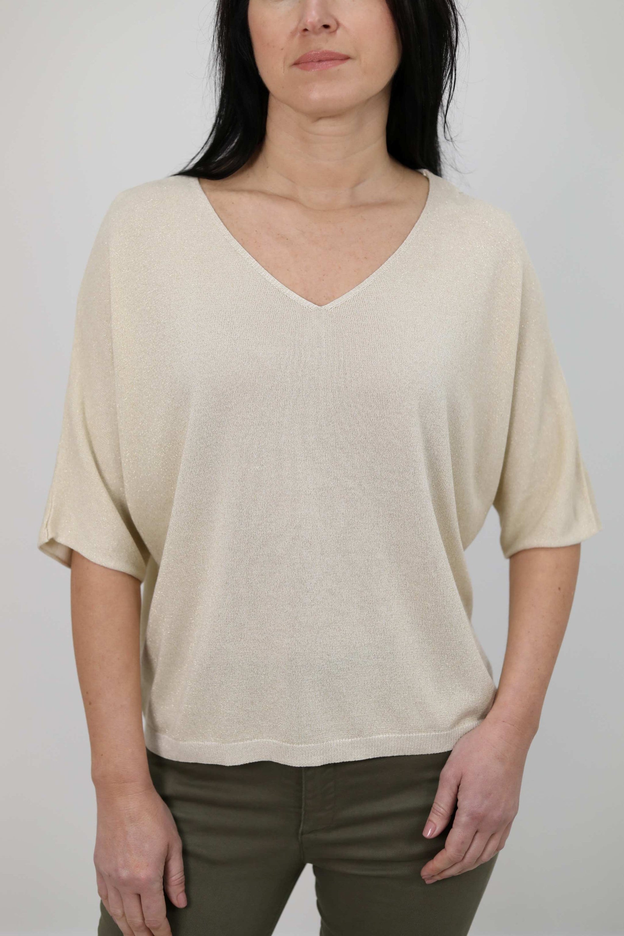 Maglia in filato leggero a base viscosa, arricchita da lurex. Presenta scollo a V e maniche a pipistrello che donano una linea morbida e fluida al capo. Fondo e polsini rifiniti a costine. Vestibilità morbida.