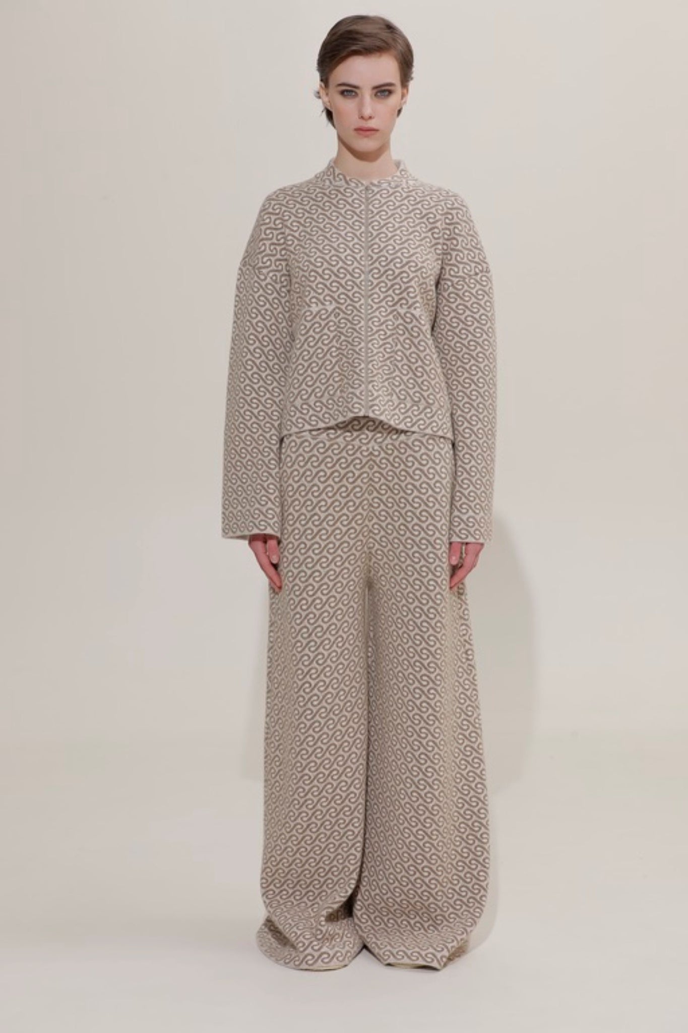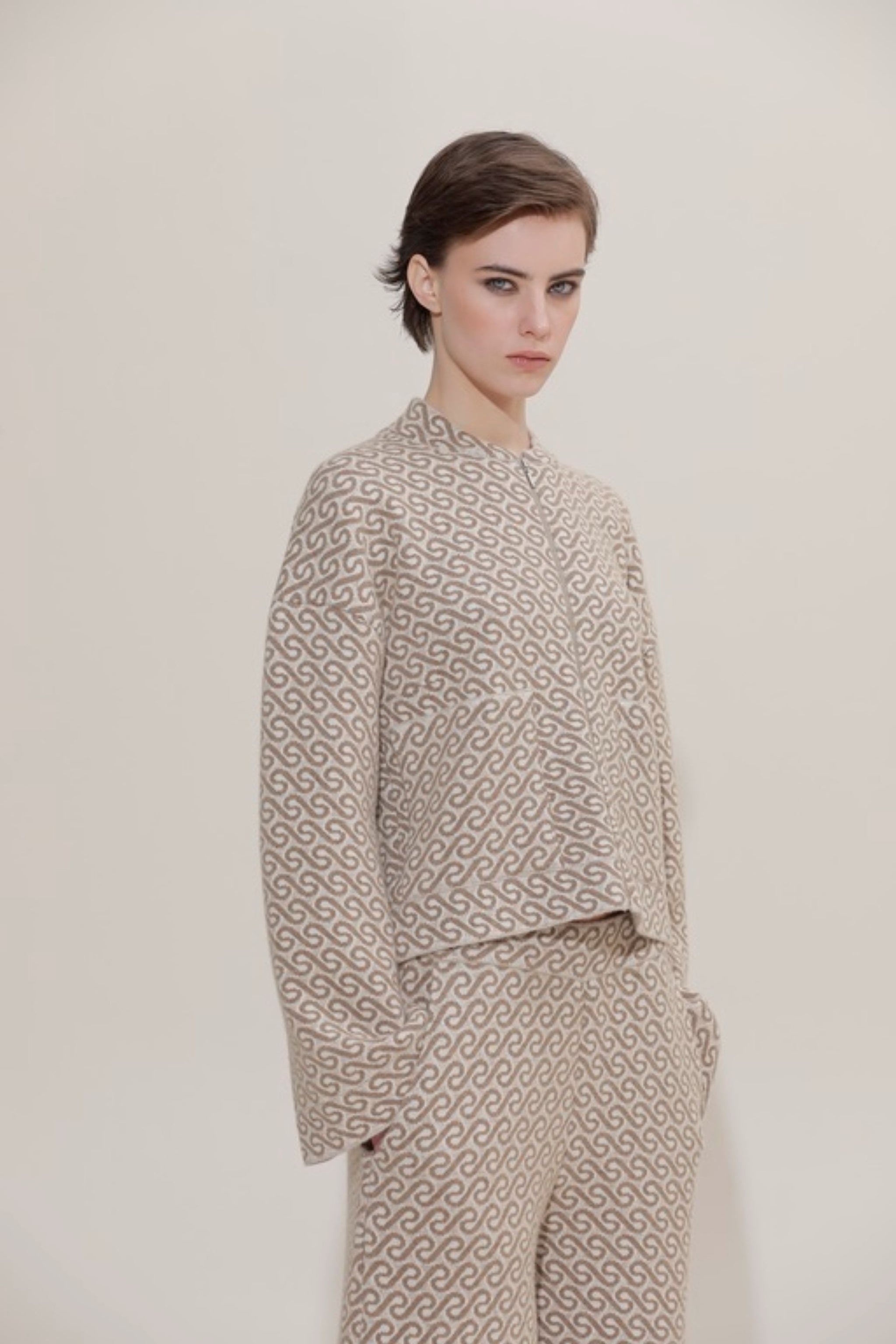 Maglia in lana merino con stampa Jacquard, manica lunga ampia e chiusura centrale con cerniera.