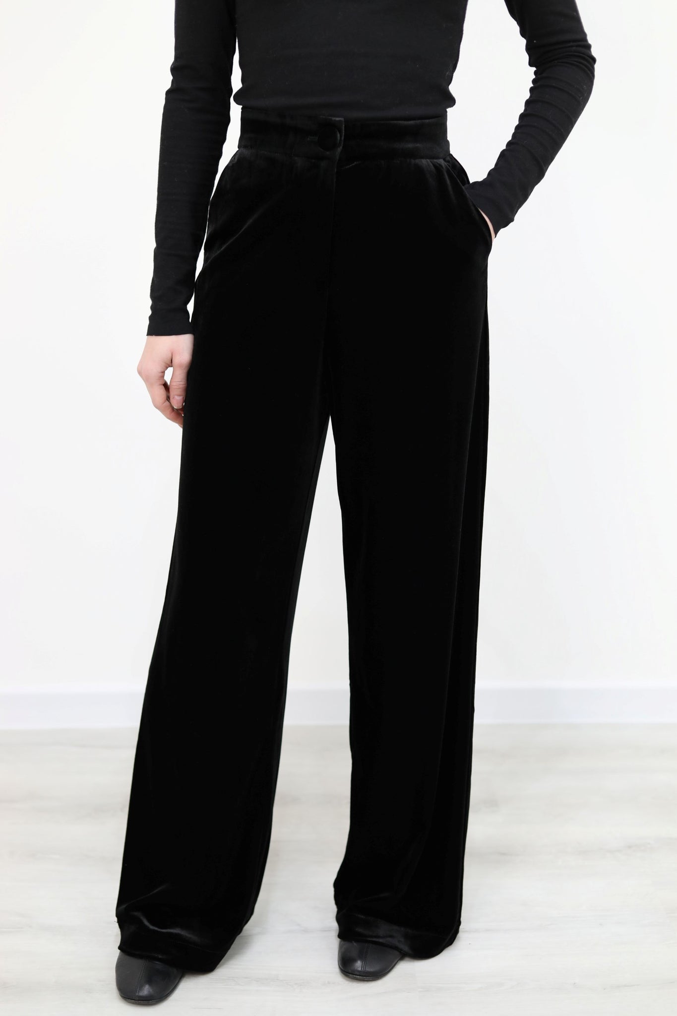 Pantalone modello dritto a vita alta in velluto, con passanti per cintura, tasche laterali e chiusura frontale con bottone e zip.
