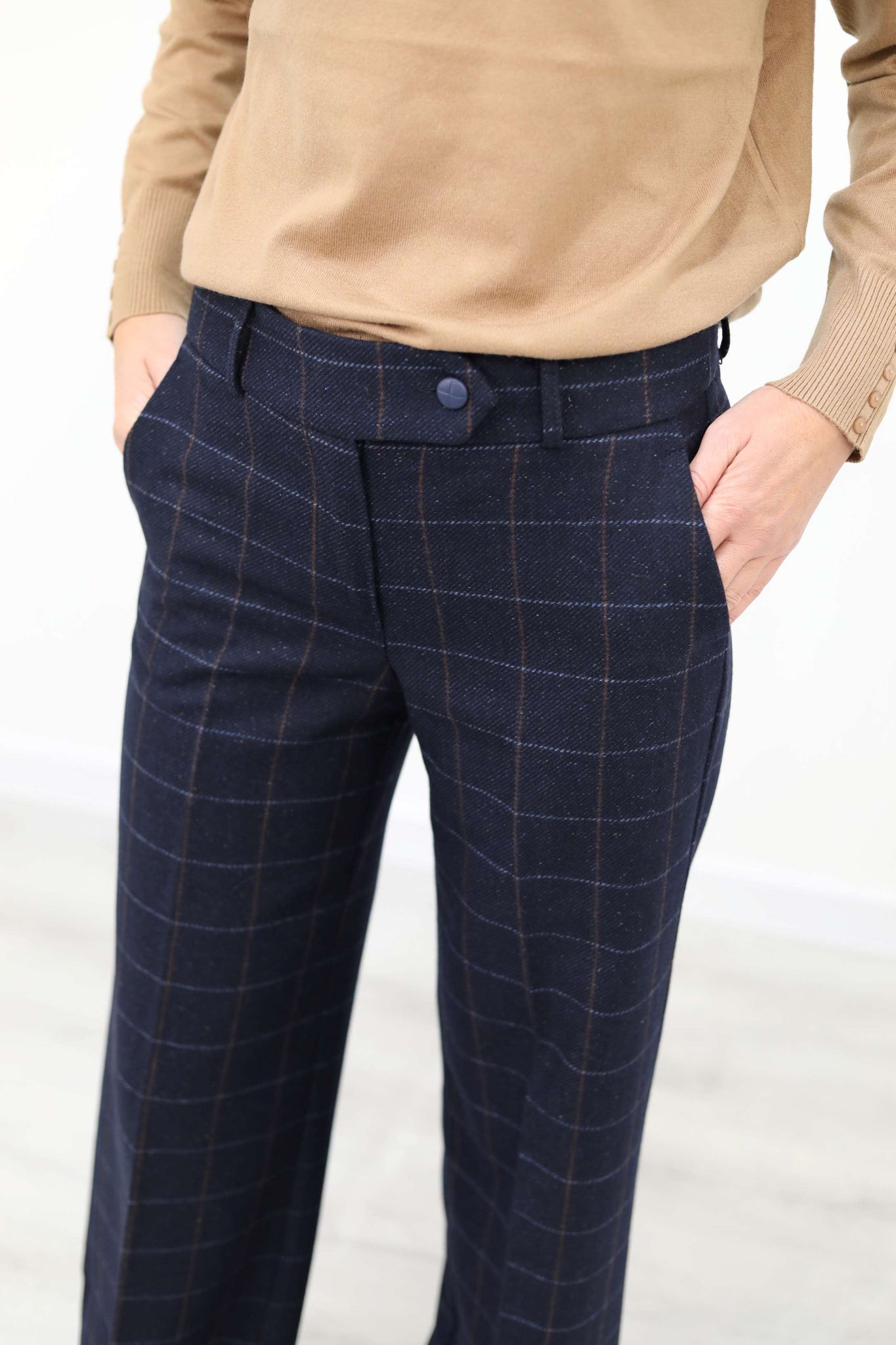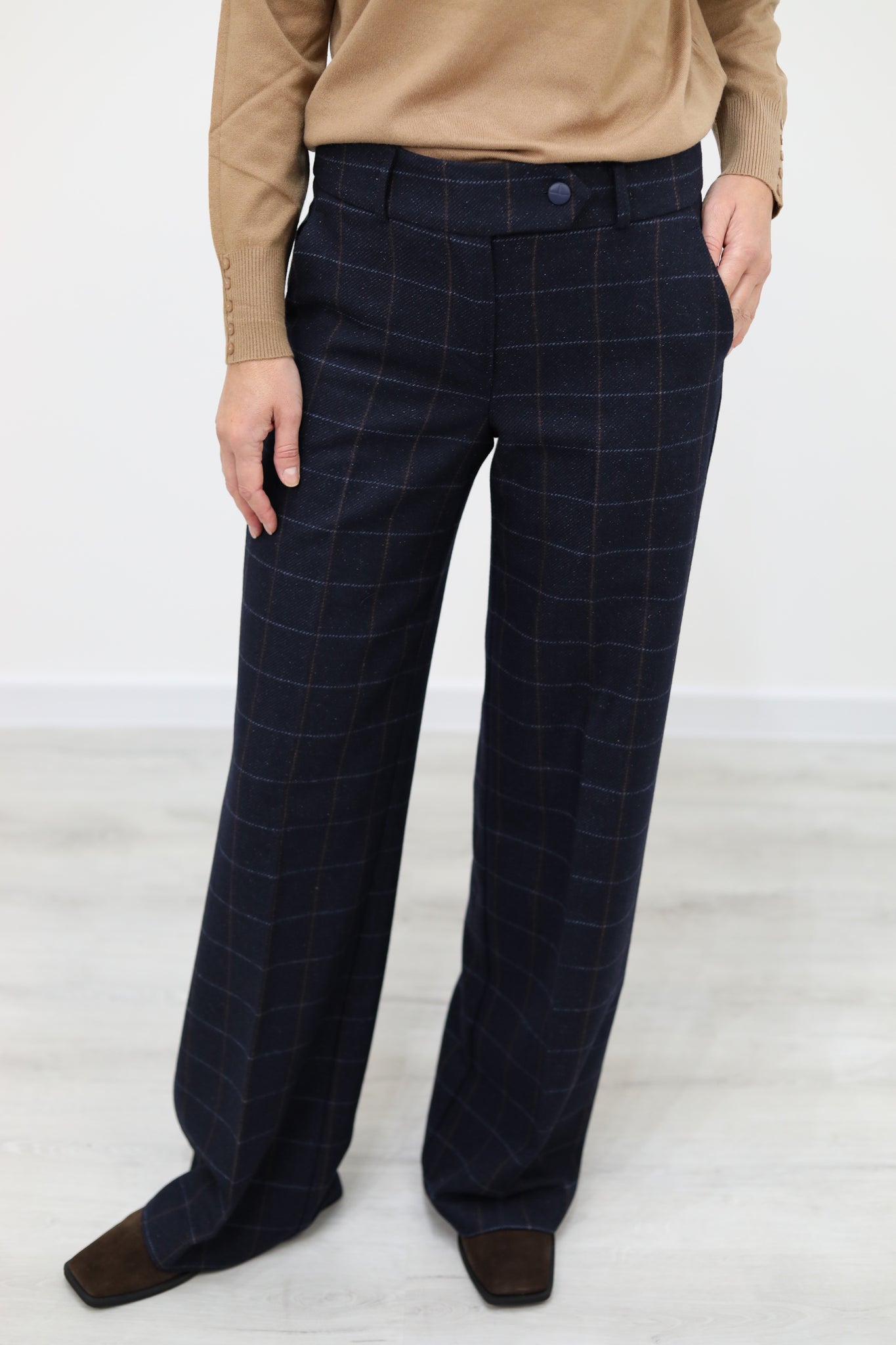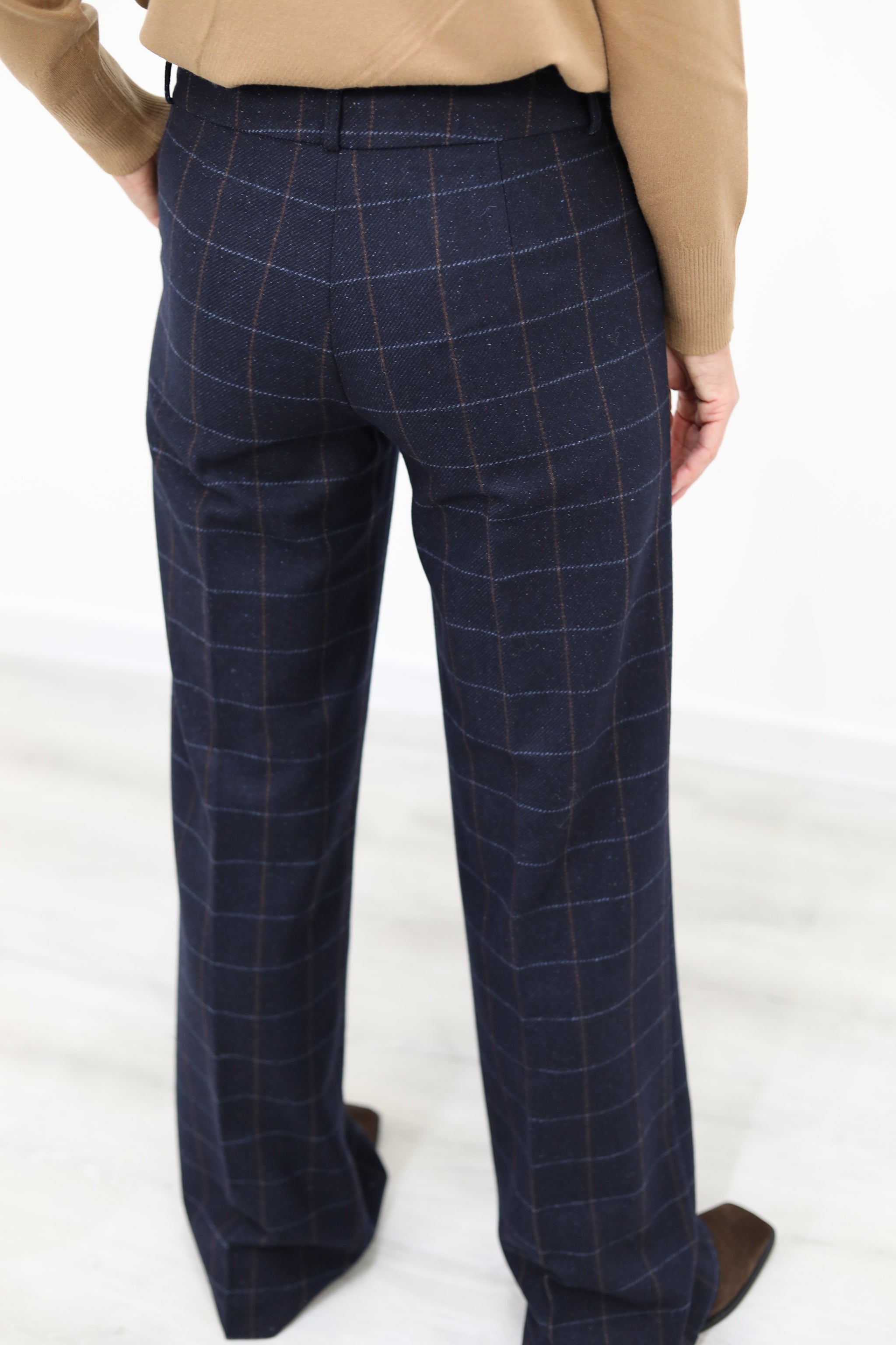 Pantalone dritto in check lana seta, con tasche a filetto, piega stirata sul davanti e citino alto con passanti. Chiusura frontale con bottone tono su tono.