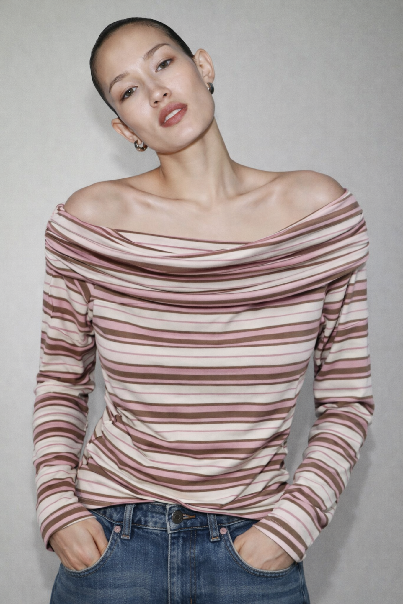 Top a manica lunga in jersey morbido ed elasticizzato. Scollo ampio a barca effetto drappeggiato. Fantasia a righe orizzontali. Arricciature elasticizzate laterali in zona vita e fianchi. Vestibilità aderente.